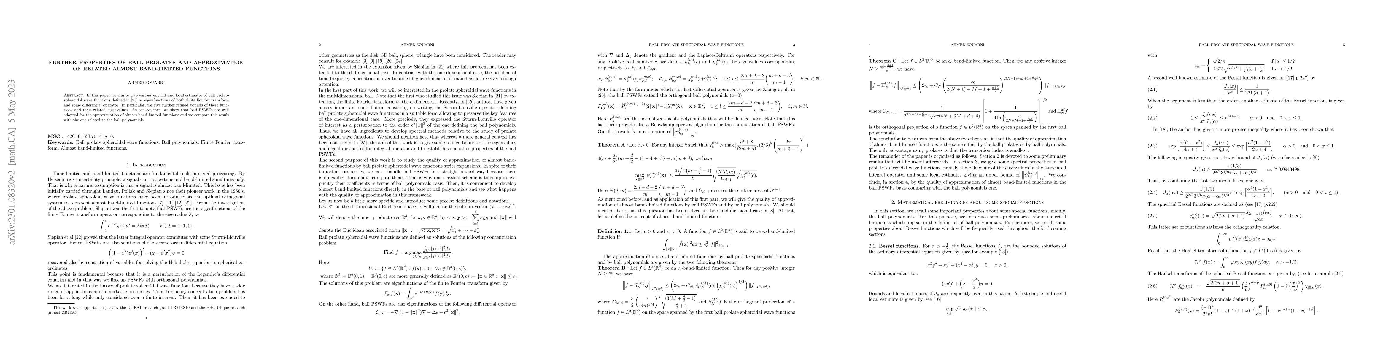 This paper provides refined bounds for ball prolate spheroidal wave functions (PSWFs) and their eigenvalues, demonstrating their suitability for approximating almost band-limited functions, and compares these results to those involving ball polynomials.