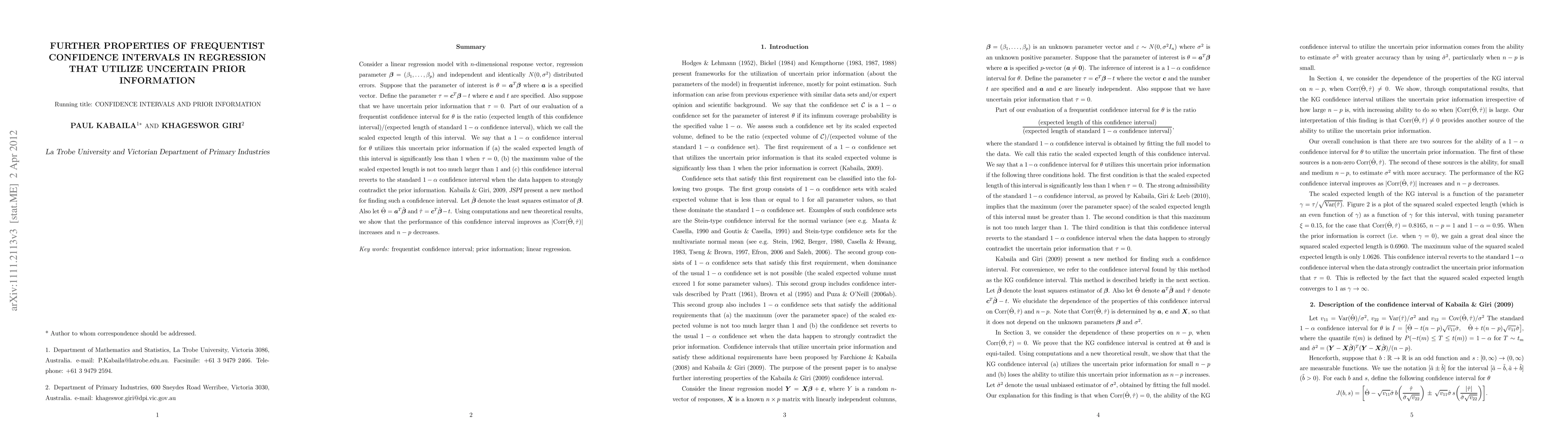 Consider a linear regression model with n-dimensional response vector, regression parameter \beta = (\beta_1, ..., \beta_p) and independent and identically N(0, \sigma^2) distributed errors. Suppose that the parameter of interest is \theta = a^T \beta where a is a specified vector. Define the parameter \tau = c^T \beta - t where c and t are specified. Also suppose that we have uncertain prior information that \tau = 0. Part of our evaluation of a frequentist confidence interval for \theta is the ratio (expected length of this confidence interval)/(expected length of standard 1-\alpha confidence interval), which we call the scaled expected length of this interval. We say that a 1-\alpha confidence interval for \theta utilizes this uncertain prior information if (a) the scaled expected length of this interval is significantly less than 1 when \tau = 0, (b) the maximum value of the scaled expected length is not too much larger than 1 and (c) this confidence interval reverts to the standard 1-\alpha confidence interval when the data happen to strongly contradict the prior information. Kabaila and Giri, 2009, JSPI present a new method for finding such a confidence interval. Let \hat\beta denote the least squares estimator of \beta. Also let \hat\Theta = a^T \hat\beta and \hat\tau = c^T \hat\beta - t. Using computations and new theoretical results, we show that the performance of this confidence interval improves as |Corr(\hat\Theta, \hat\tau)| increases and n-p decreases.