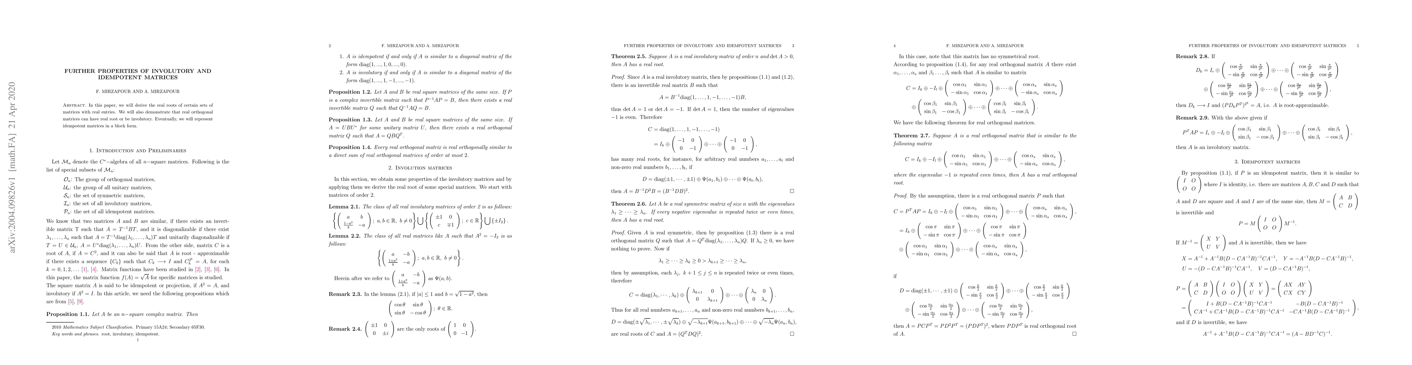 This paper explores the properties of involutory and idempotent matrices, deriving the real roots of specific matrices with real entries and demonstrating that real orthogonal matrices can either have real roots or be involutory. It also represents idempotent matrices in a block form.