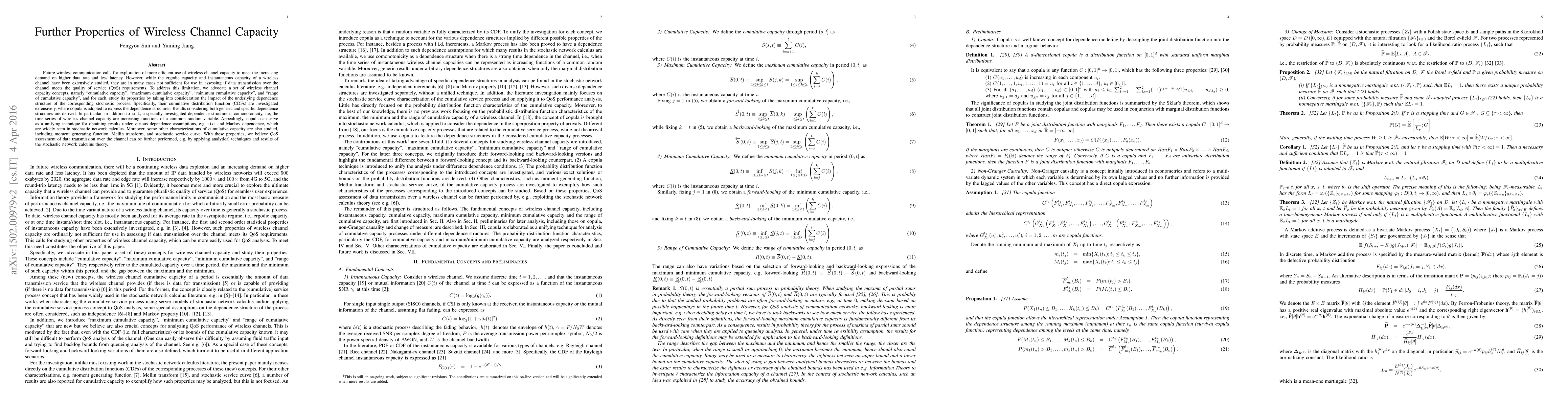 Future wireless communication calls for exploration of more efficient use of wireless channel capacity to meet the increasing demand on higher data rate and less latency. However, while the ergodic capacity and instantaneous capacity of a wireless channel have been extensively studied, they are in many cases not sufficient for use in assessing if data transmission over the channel meets the quality of service (QoS) requirements. To address this limitation, we advocate a set of wireless channel capacity concepts, namely "cumulative capacity", "maximum cumulative capacity", "minimum cumulative capacity", and "range of cumulative capacity", and for each, study its properties by taking into consideration the impact of the underlying dependence structure of the corresponding stochastic process. Specifically, their cumulative distribution function (CDFs) are investigated extensively, where copula is adopted to express the dependence structures. Results considering both generic and specific dependence structures are derived. In particular, in addition to i.i.d., a specially investigated dependence structure is comonotonicity, i.e, the time series of wireless channel capacity are increasing functions of a common random variable. Appealingly, copula can serve as a unifying technique for obtaining results under various dependence assumptions, e.g. i.i.d. and Markov dependence, which are widely seen in stochastic network calculus. Moreover, some other characterizations of cumulative capacity are also studied, including moment generating function, Mellin transform, and stochastic service curve. With these properties, we believe QoS assessment of data transmission over the channel can be further performed, e.g. by applying analytical techniques and results of the stochastic network calculus theory.