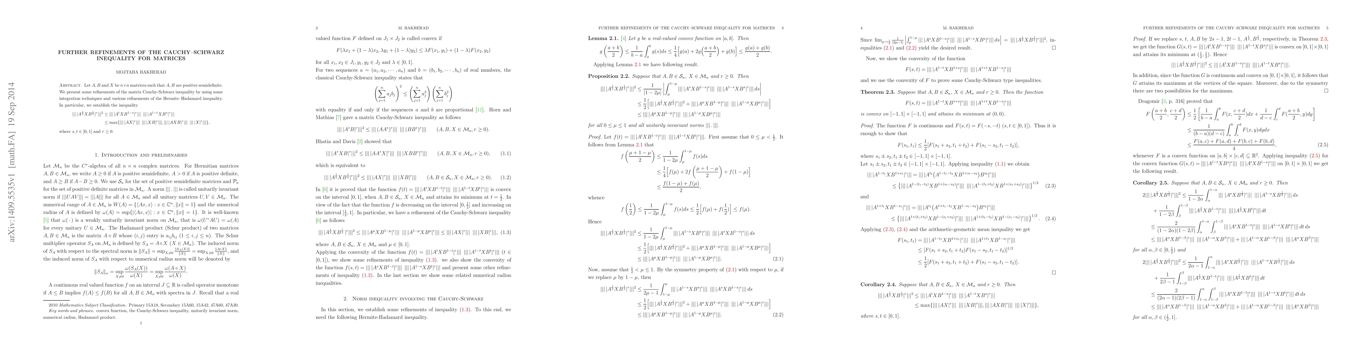 The paper presents refinements of the Cauchy-Schwarz inequality for matrices using integration techniques and Hermite-Hadamard inequality refinements.