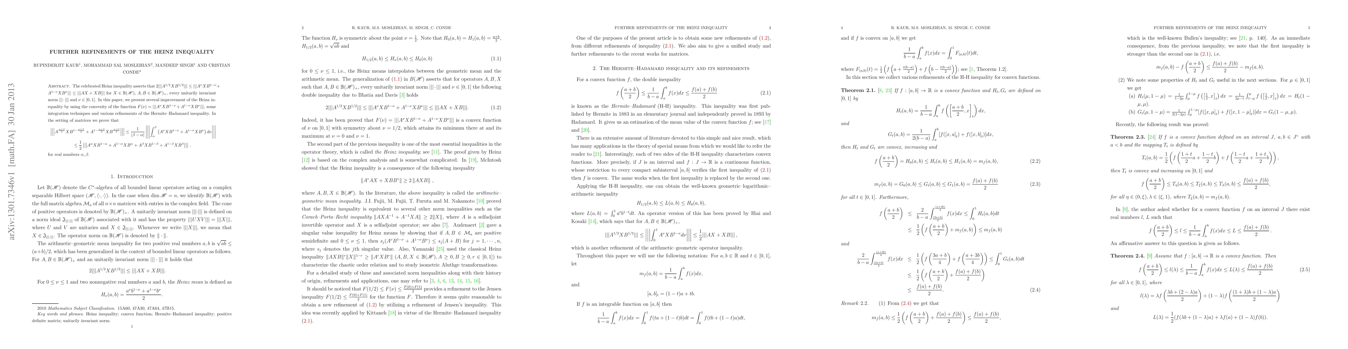 This paper refines the Heinz inequality using convexity and integration techniques, proving that for matrices and real numbers $\alpha, \beta$, the inequality \[ \left|\left|\left|A^{\frac{\alpha+\beta}{2}}XB^{1-\frac{\alpha+\beta}{2}}+A^{1-\frac{\alpha+\beta}{2}}XB^{\frac{\alpha+\beta}{2}}\right|\right|\right|\leq \frac{1}{|\beta-\alpha|}\left|\left|\left|\int_{\alpha}^{\beta}\left(A^{\nu}XB^{1-\nu}+A^{1-\nu}XB^{\nu}\right)d\nu\right|\right|\right|\leq \frac{1}{2}\left|\left|\left|A^{\alpha}XB^{1-\alpha}+A^{1-\alpha}XB^{\alpha}+A^{\beta}XB^{1-\beta}+A^{1-\beta}XB^{\beta}\right|\right|\right| \] holds.