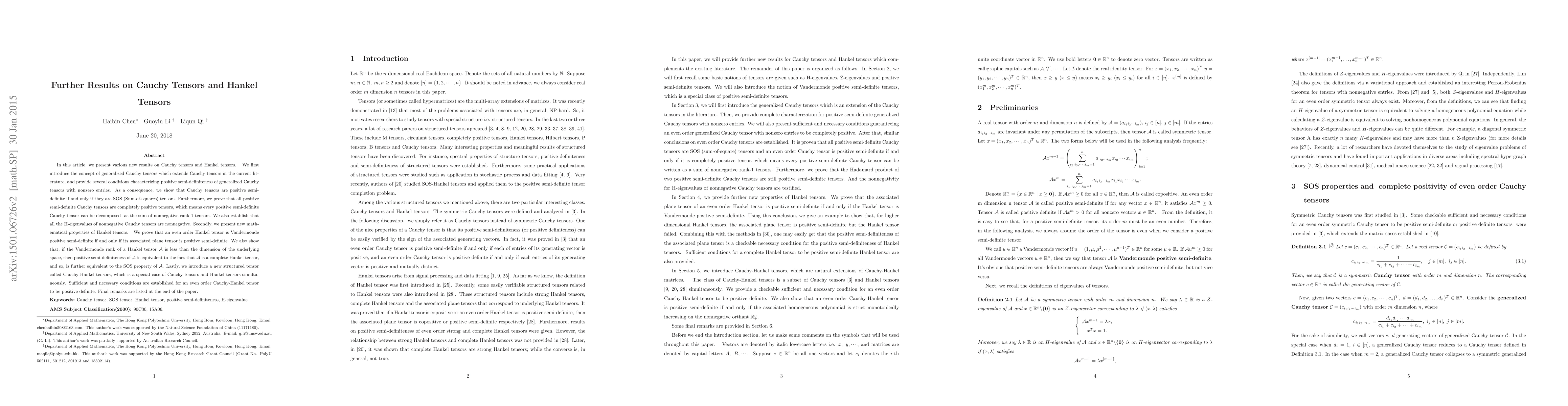This paper extends the study of Cauchy and Hankel tensors, introducing generalized Cauchy tensors and proving conditions for their positive semi-definiteness. It establishes that Cauchy tensors are positive semi-definite if and only if they are sum-of-squares tensors and that all positive semi-definite Cauchy tensors are completely positive. It also explores properties of Hankel tensors, including the equivalence of positive semi-definiteness for even order Hankel tensors and their associated plane tensors.
