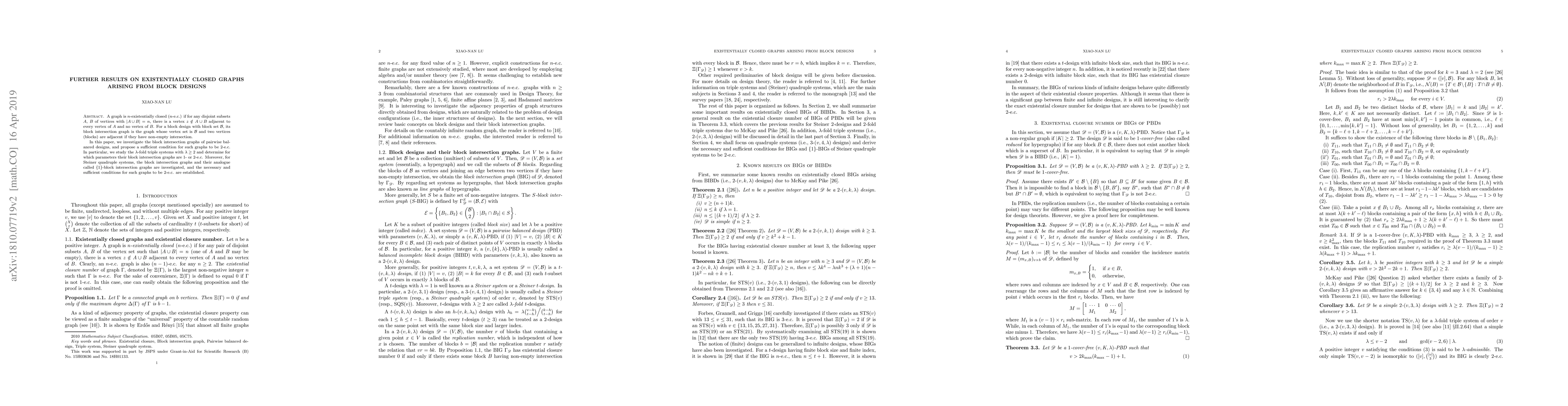 This paper explores the block intersection graphs derived from pairwise balanced designs, establishing sufficient conditions for these graphs to be 2-existentially closed. It specifically investigates $\lambda$-fold triple systems and Steiner quadruple systems, determining when their block intersection graphs are 1- or 2-existentially closed.