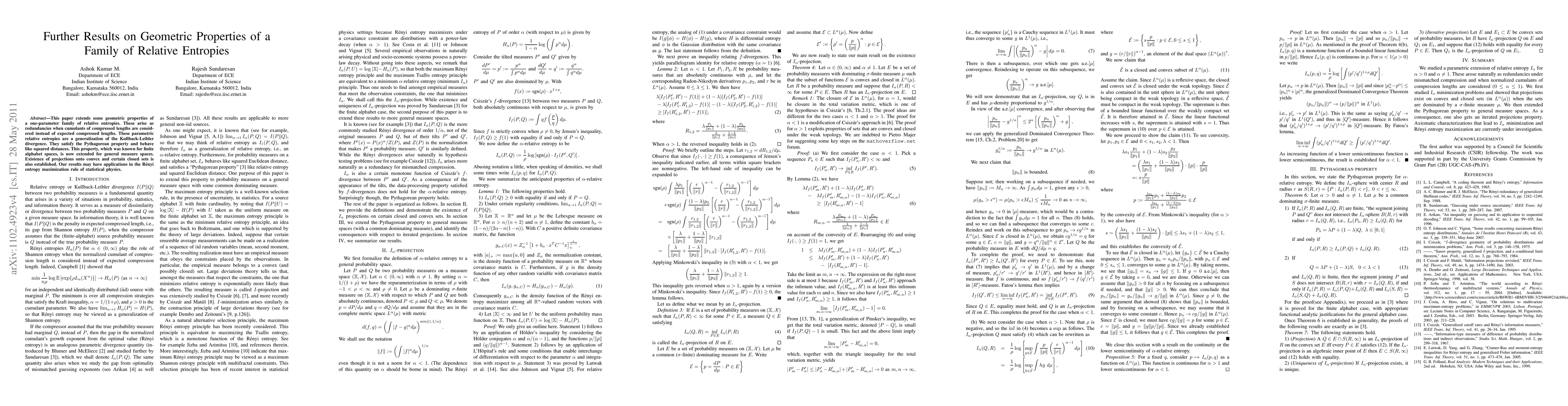 A study extends geometric properties of relative entropies, a generalization of Kullback-Leibler divergence, showing they satisfy the Pythagorean property and behave like squared distances, with potential applications in statistical physics.