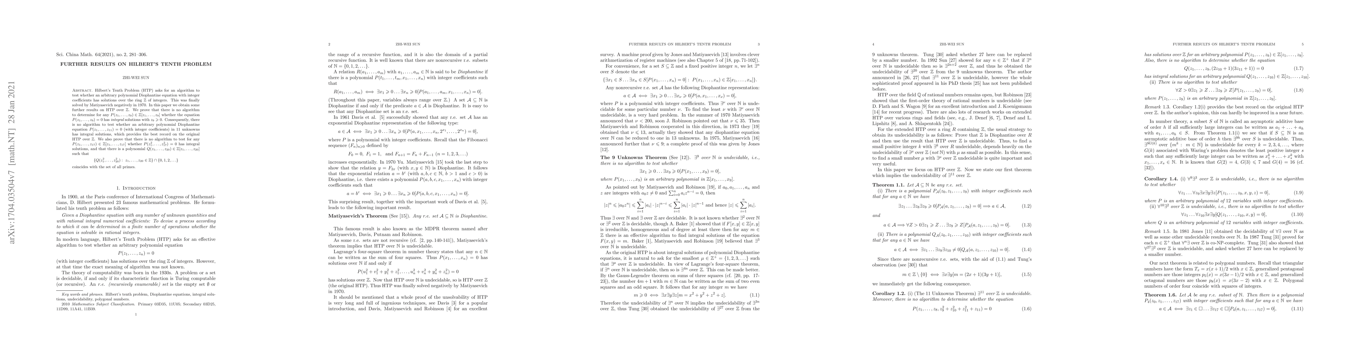 Hilbert's Tenth Problem (HTP) asks for an algorithm to test whether an arbitrary polynomial Diophantine equation with integer coefficients has solutions over the ring $\mathbb Z$ of the integers. This was finally solved by Matiyasevich negatively in 1970. In this paper we obtain some further results on HTP over $\mathbb Z$. We prove that there is no algorithm to determine for any $P(z_1,\ldots,z_9)\in\mathbb Z[z_1,\ldots,z_9]$ whether the equation $P(z_1,\ldots,z_9)=0$ has integral solutions with $z_9\ge0$. Consequently, there is no algorithm to test whether an arbitrary polynomial Diophantine equation $P(z_1,\ldots,z_{11})=0$ (with integer coefficients) in 11 unknowns has integral solutions, which provides the best record on the original HTP over $\mathbb Z$. We also prove that there is no algorithm to test for any $P(z_1,\ldots,z_{17})\in\mathbb Z[z_1,\ldots,z_{17}]$ whether $P(z_1^2,\ldots,z_{17}^2)=0$ has integral solutions, and that there is a polynomial $Q(z_1,\ldots,z_{20})\in\mathbb Z[z_1,\ldots,z_{20}]$ such that $$\{Q(z_1^2,\ldots,z_{20}^2):\ z_1,\ldots,z_{20}\in\mathbb Z\}\cap\{0,1,2,\ldots\}$$ coincides with the set of all primes.