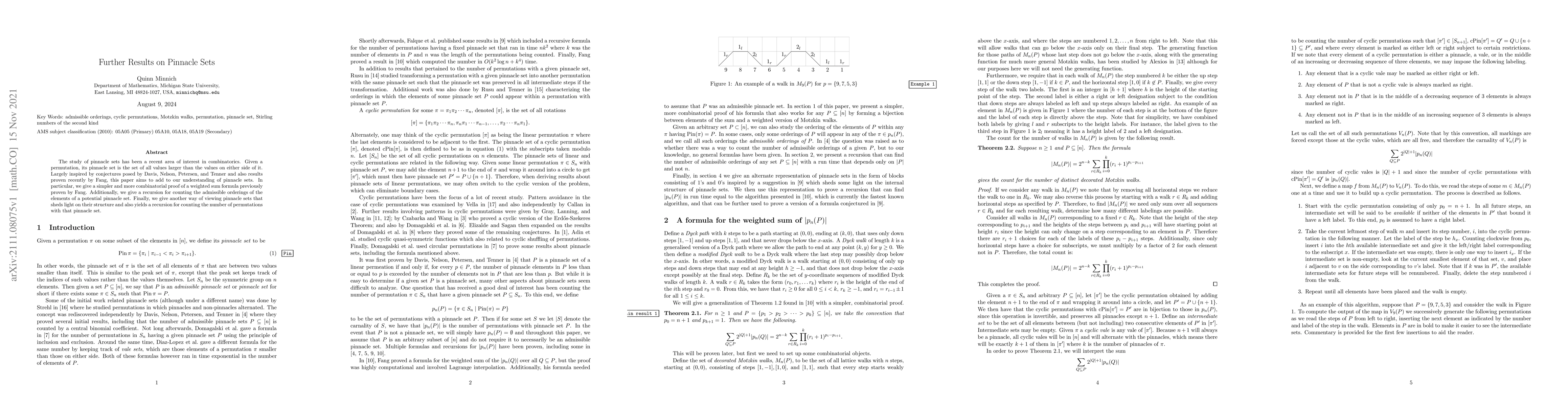 This paper provides a simpler combinatorial proof for a weighted sum formula regarding pinnacle sets and introduces a recursion for counting admissible orderings. It also offers an alternative perspective on pinnacle sets, revealing their structure and yielding a new recursion for counting permutations with a given pinnacle set.