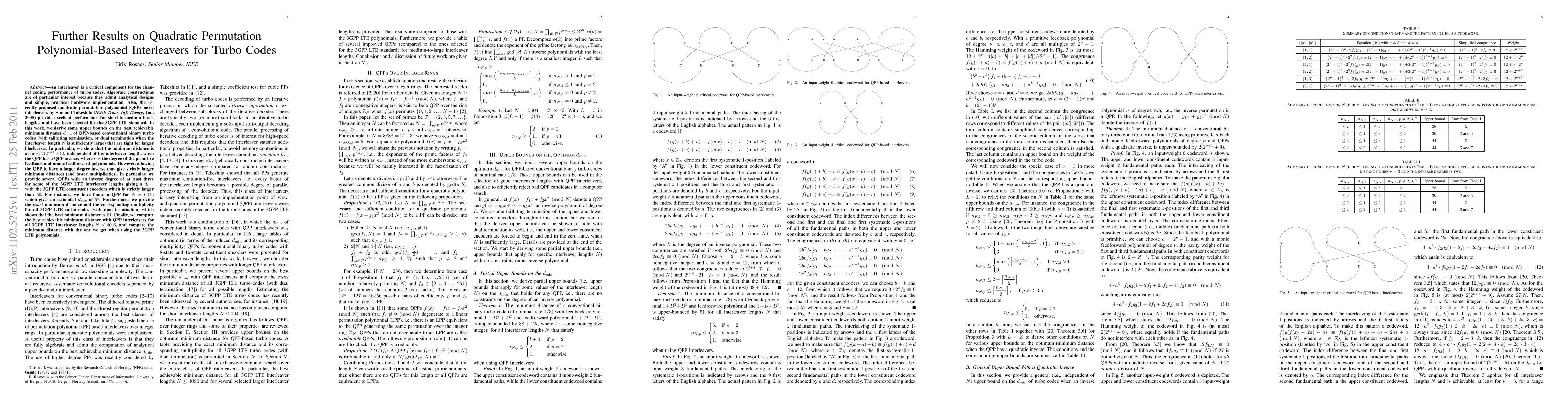This paper derives upper bounds on the minimum distance of QPP-based interleavers for turbo codes, showing that the minimum distance is at most 2(2^{\nu +1}+9) for QPPs with a QPP inverse. It also identifies QPPs with higher inverse degrees that yield larger minimum distances, providing examples for 3GPP LTE interleaver lengths.
