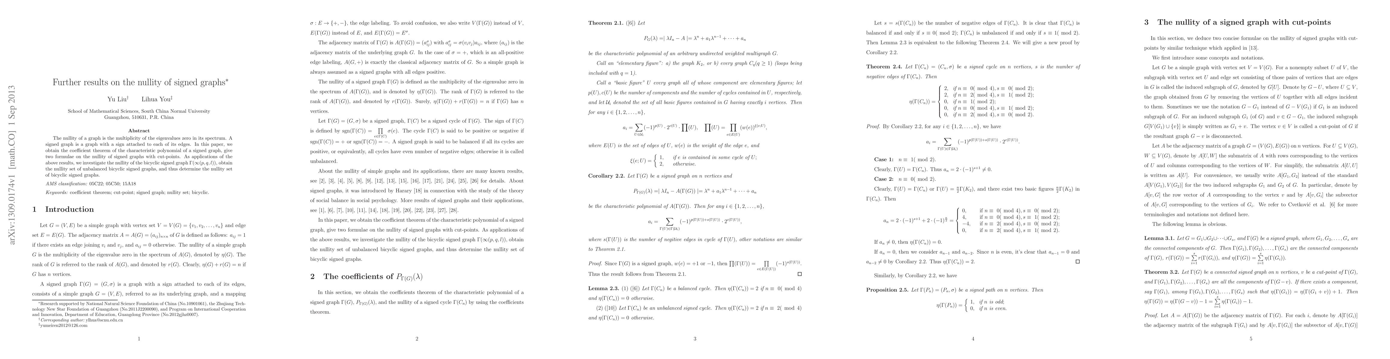 The paper presents new theoretical results on the nullity of signed graphs, specifically bicyclic signed graphs, including a coefficient theorem for characteristic polynomials and formulae for nullity with cut-points.
