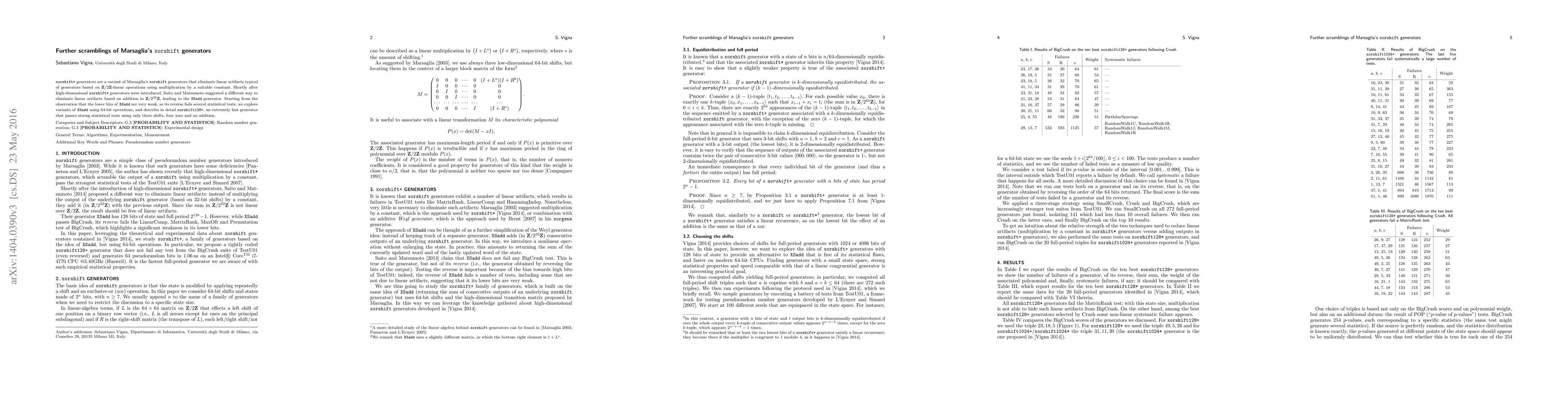 This paper introduces xorshift+, a refined version of the XSadd generator, which utilizes 64-bit operations to enhance the quality of high-dimensional random number generators, addressing the weaknesses in the lower bits of XSadd. The resulting generators are both extremely fast and high-quality.