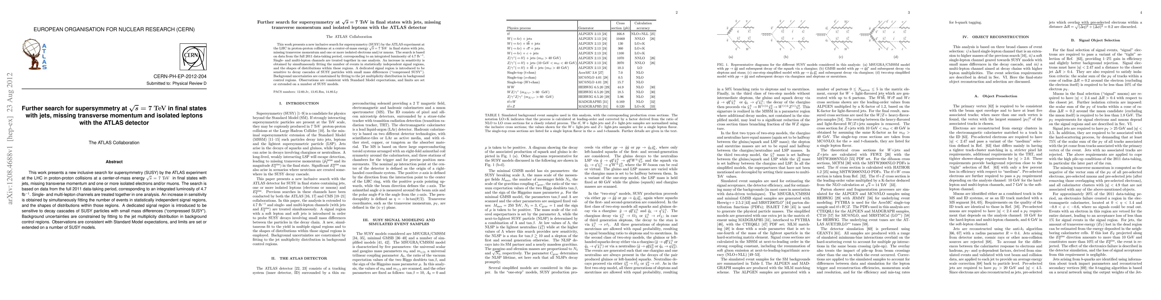 This paper reports an inclusive search for supersymmetry by the ATLAS experiment at the LHC, analyzing proton-proton collisions at 7 TeV with jets, missing transverse momentum, and isolated leptons. No evidence of SUSY was found, leading to new limits on various SUSY models.