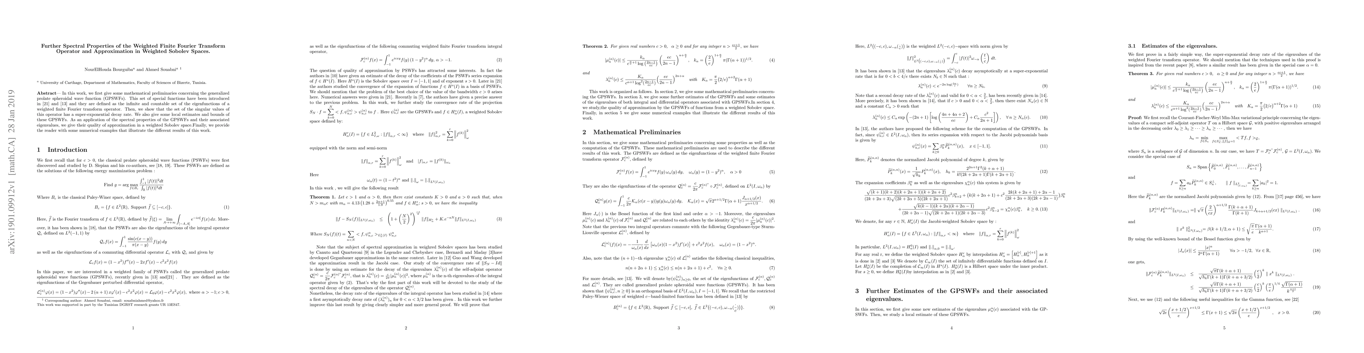 In this work, we first give some mathematical preliminairies concerning the generelized prolate spheroidal wave functions(GPSWFs). This set of special functions have been introduced in [21]and [13] and they are defined as the infinite and countable set of the eigenfunctions of a weighted finite Fourier transform operator. Then, we show that the set of the singular values of this operator has a super-exponential decay rate. We also give some local estimates and bounds of these GPSWFs. As an application of the spectral properties of the GPSWFs and their associated eigenvalues, we give their quality of approximation in a weighted Sobolev space.Finally, we provide the reader with some numerical examples that illustrate the different results of this work.