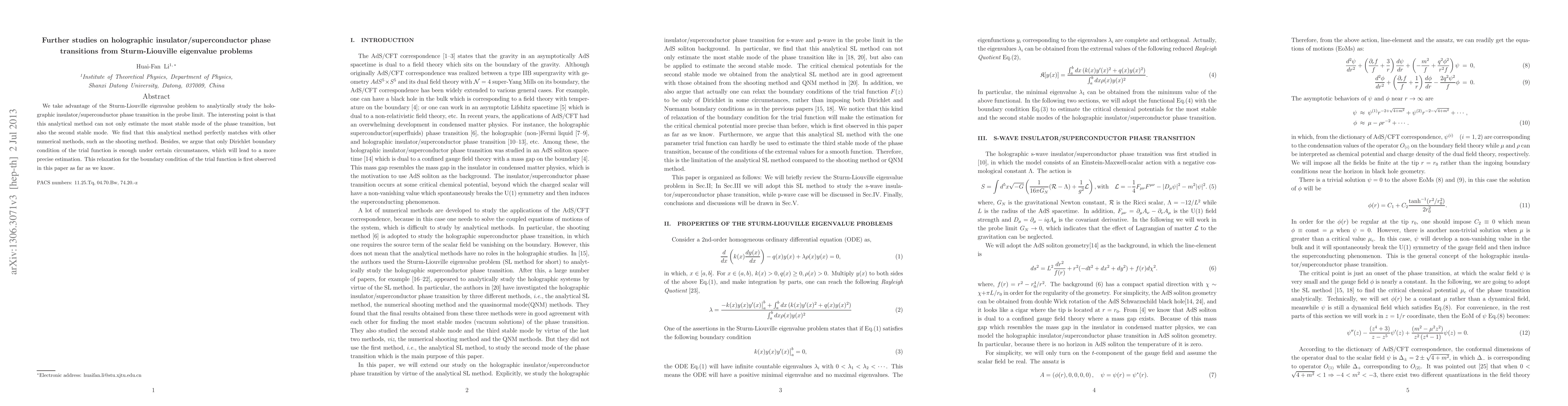 This paper uses the Sturm-Liouville eigenvalue problem to analytically study the holographic insulator/superconductor phase transition, estimating both the most and second stable modes. The method matches numerical results and suggests that Dirichlet boundary conditions can suffice under certain conditions, offering a more precise estimation.