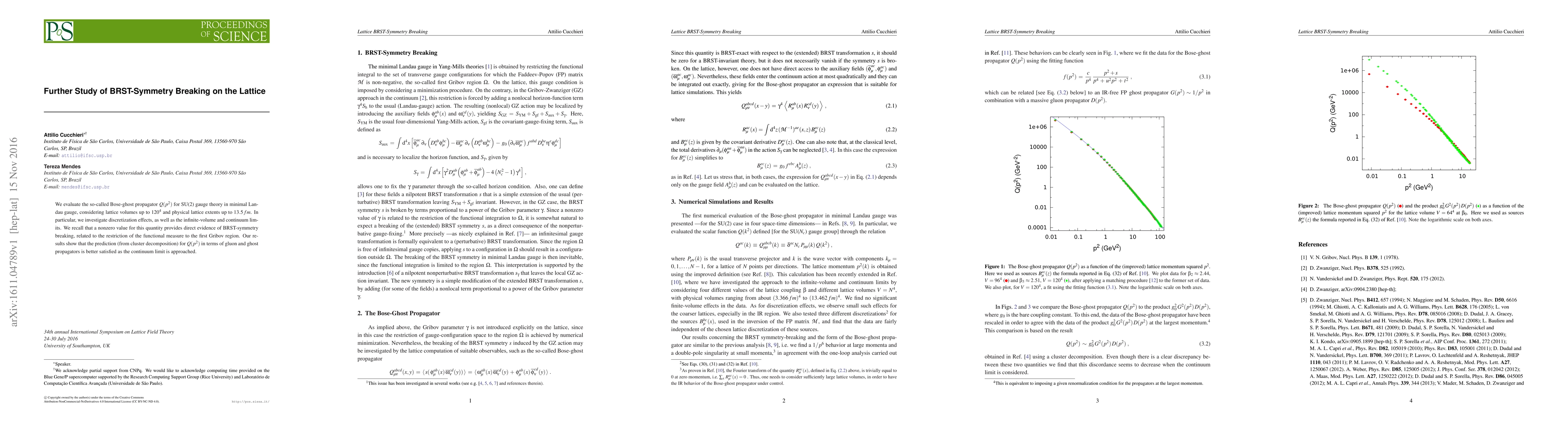 We evaluate the so-called Bose-ghost propagator Q(p^2) for SU(2) gauge theory in minimal Landau gauge, considering lattice volumes up to 120^4 and physical lattice extents up to 13.5 f. In particular, we investigate discretization effects, as well as the infinite-volume and continuum limits. We recall that a nonzero value for this quantity provides direct evidence of BRST-symmetry breaking, related to the restriction of the functional measure to the first Gribov region. Our results show that the prediction (from cluster decomposition) for Q(p^2) in terms of gluon and ghost propagators is better satisfied as the continuum limit is approached.