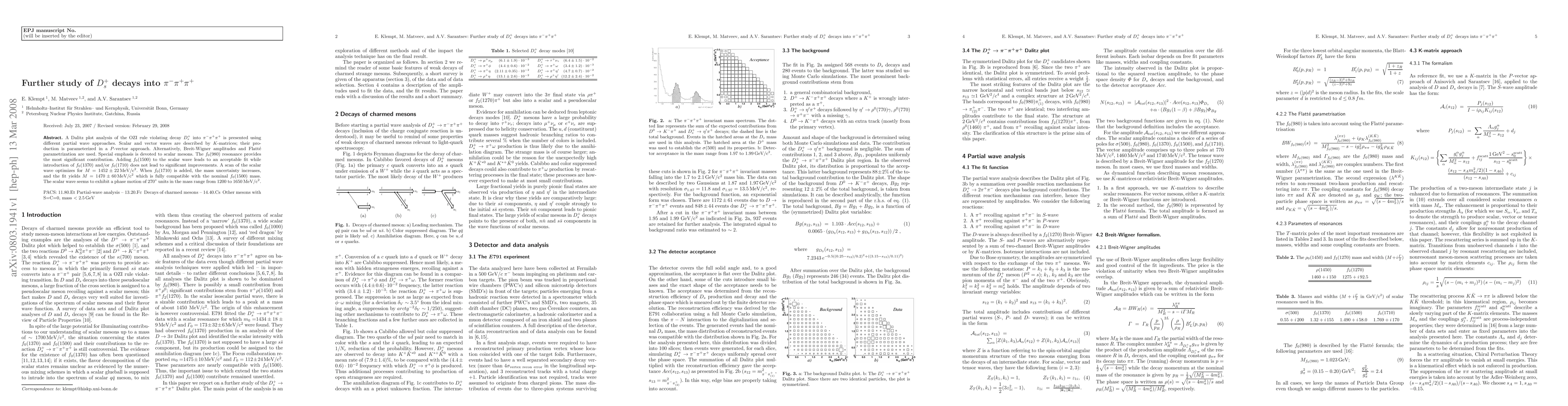 A Dalitz plot analysis of the OZI rule violating decay $D^+_s$ into $\pi^- \pi^+ \pi^+$ is presented using different partial wave approaches. Scalar and vector waves are described by $K$-matrices; their production is parameterized in a $P$-vector approach. Alternatively, Breit-Wigner amplitudes and Flatt\'e parametrization are used. Special emphasis is devoted to scalar mesons. The $f_0(980)$ resonance provides the most significant contribution. Adding $f_0(1500)$ to the scalar wave leads to an acceptable fit while introduction of $f_0(1370)$ and/or $f_0(1710)$ does not lead to significant improvements. A scan of the scalar wave optimizes for $M=1452\pm 22$ MeV/c$^2$. When $f_0(1710)$ is added, the mass uncertainty increases, and the fit yields $M=1470\pm 60$ MeV/c$^2$ which is fully compatible with the nominal $f_0(1500)$ mass. The scalar wave seems to exhibit a phase motion of 270$^{\circ}$ units in the mass range from 1200 to 1650 MeV/c$^2$.