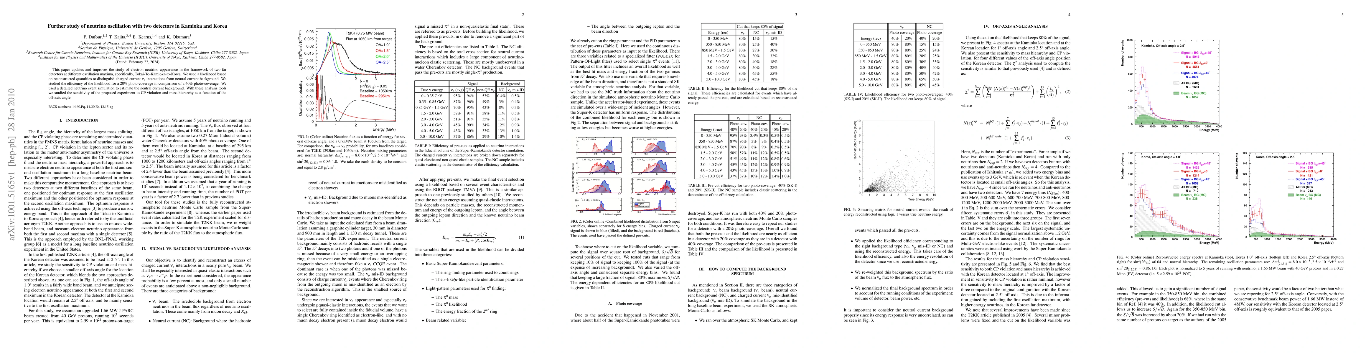 This paper refines the study of electron neutrino appearance using two detectors in Kamioka and Korea, employing a likelihood-based method to distinguish $\nu_e$ interactions. It evaluates the efficiency of different photo-coverage levels and assesses the experiment's sensitivity to CP violation and mass hierarchy.