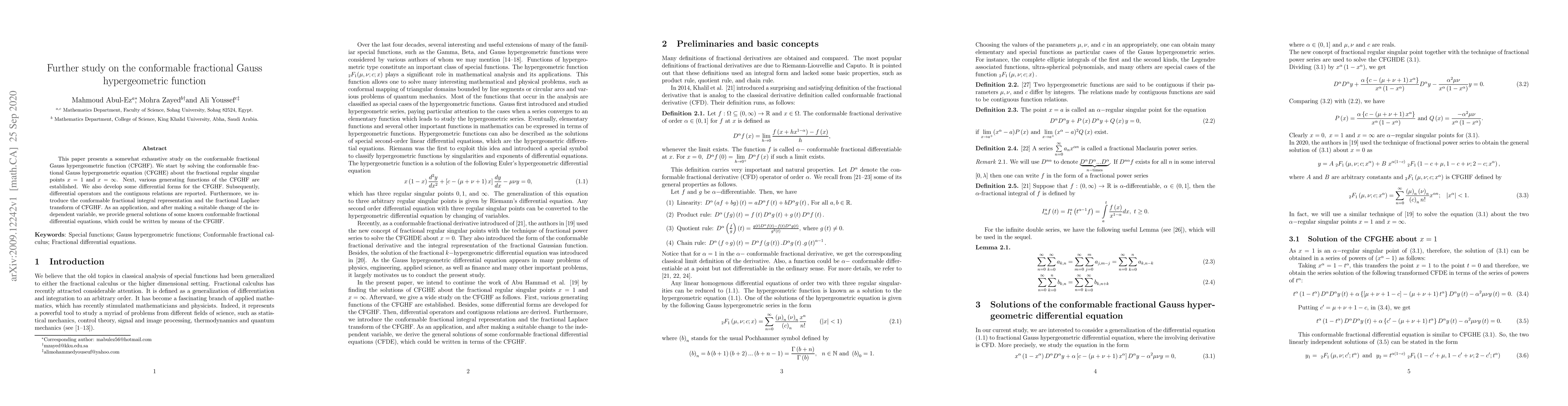 This paper thoroughly investigates the conformable fractional Gauss hypergeometric function, solving its equation at fractional regular singular points and establishing generating functions, differential forms, and integral representations. It also provides general solutions for certain conformable fractional differential equations using the CFGHF.