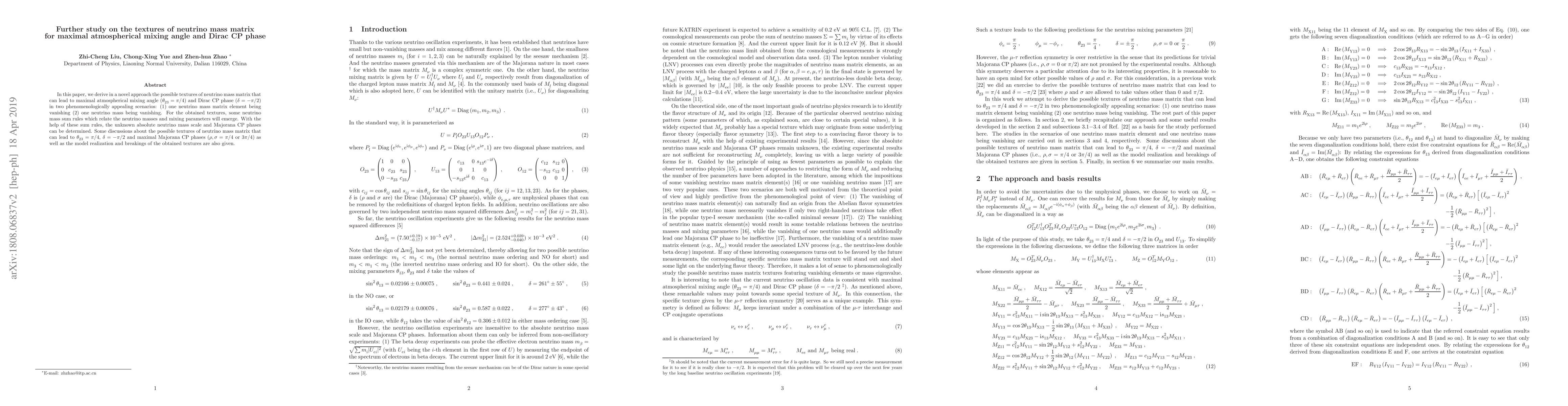 This paper explores novel textures of the neutrino mass matrix that achieve maximal atmospheric mixing angle and Dirac CP phase, considering scenarios where a matrix element or a neutrino mass vanishes. It derives sum rules to determine the absolute neutrino mass and Majorana CP phases, and discusses model realizations for these textures.