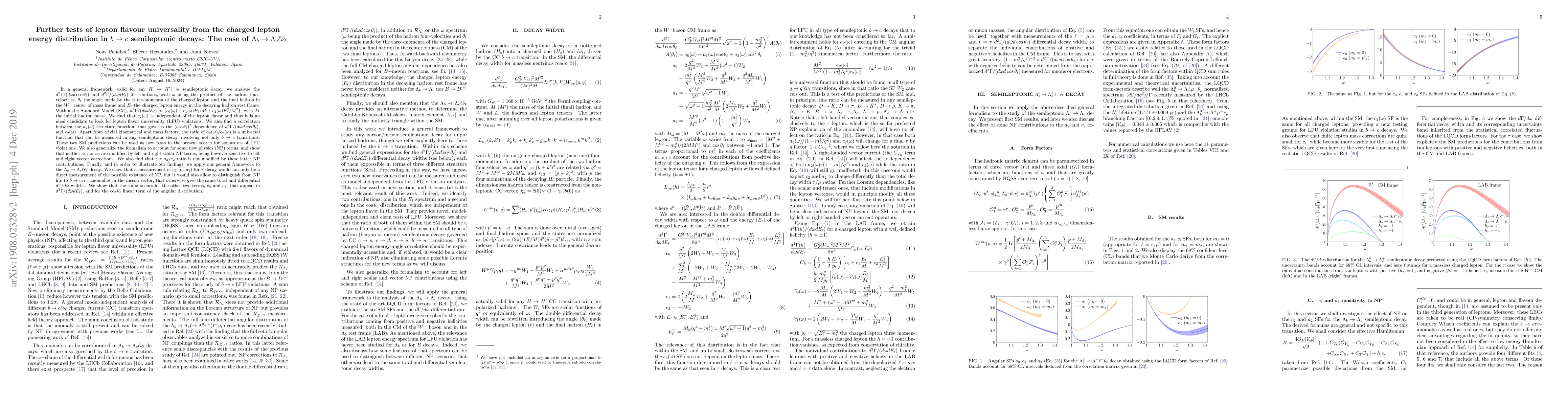 In a general framework, valid for any $H\to H'\ell^-\bar\nu_\ell$ semileptonic decay, we analyze the $d^2\Gamma/(d\omega d\cos\theta_\ell)$ and $d^2\Gamma/ (d\omega dE_\ell)$ distributions, with $\omega$ being the product of the hadron four-velocities, $\theta_\ell$ the angle made by the three-momenta of the charged lepton and the final hadron in the $W^-$ center of mass frame and $E_\ell$ the charged lepton energy in the decaying hadron rest frame. Within the Standard Model (SM), $ d^2\Gamma/(d\omega dE_\ell)\propto \left(c_0(\omega)+c_1(\omega)E_\ell/M+c_2(\omega)E^2_\ell/M^2\right)$, with $M$ the initial hadron mass. We find that $c_2(\omega)$ is independent of the lepton flavor and thus it is an ideal candidate to look for lepton flavor universality (LFU) violations. We also find a correlation between the $a_2(\omega)$ structure function, that governs the $(\cos\theta_\ell)^2$ dependence of $d^2\Gamma/(d\omega d\cos\theta_\ell)$, and $c_2(\omega)$. Apart from trivial kinematical and mass factors, the ratio of $a_2(\omega)/c_2(\omega)$ is a universal function that can be measured in any semileptonic decay, involving not only $b\to c$ transitions. These two SM predictions can be used as new tests in the present search for signatures of LFU violations. We also generalize the formalism to account for some new physics (NP) terms. Finally, in order to illustrate our findings, we apply our general framework to the $\Lambda_b\to \Lambda_c \ell \bar\nu_\ell$ decay. We show that a measurement of $c_2$ (or $a_2$) for $\tau$ decay would not only be a direct measurement of the possible existence of NP, but it would also allow to distinguish from NP fits to $b\to c\tau\bar\nu_\tau$ anomalies in the meson sector, that otherwise give the same total and differential $d\Gamma/d\omega$ widths.