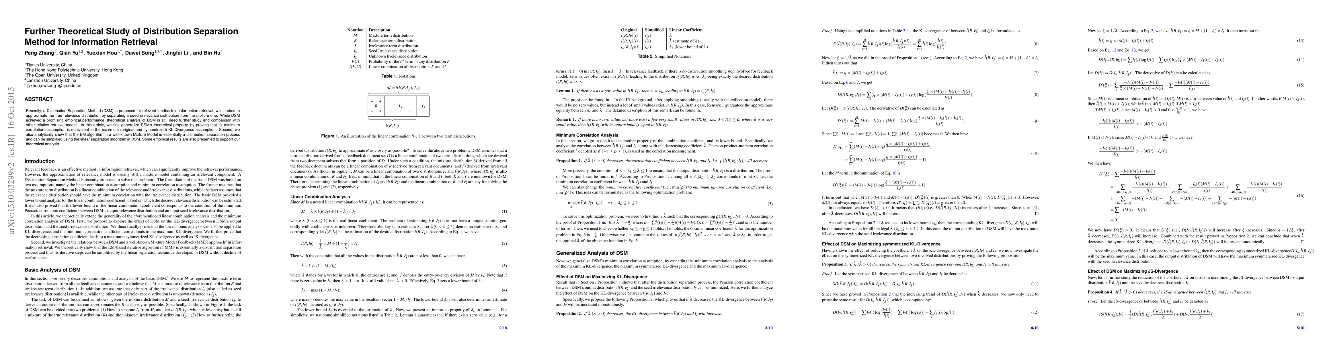 Recently, a Distribution Separation Method (DSM) is proposed for relevant feedback in information retrieval, which aims to approximate the true relevance distribution by separating a seed irrelevance distribution from the mixture one. While DSM achieved a promising empirical performance, theoretical analysis of DSM is still need further study and comparison with other relative retrieval model. In this article, we first generalize DSM's theoretical property, by proving that its minimum correlation assumption is equivalent to the maximum (original and symmetrized) KL-Divergence assumption. Second, we also analytically show that the EM algorithm in a well-known Mixture Model is essentially a distribution separation process and can be simplified using the linear separation algorithm in DSM. Some empirical results are also presented to support our theoretical analysis.