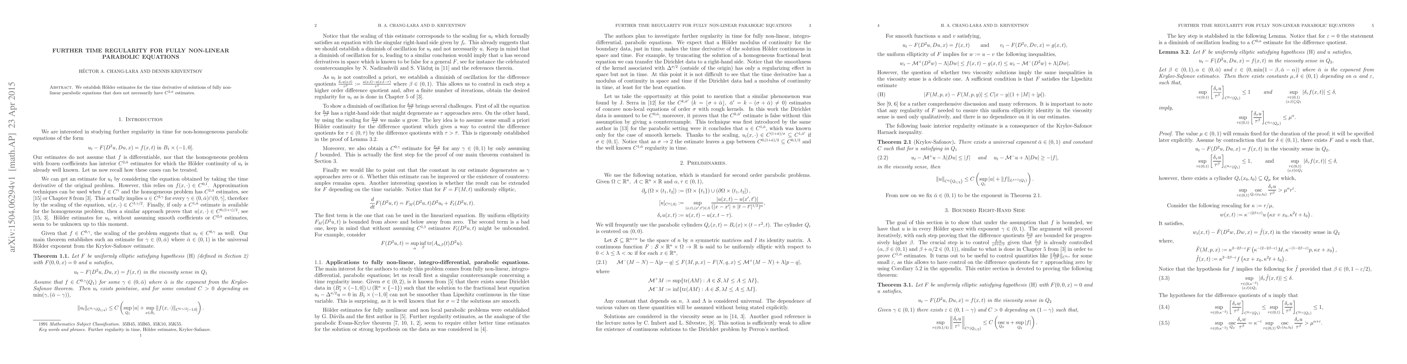 We establish H\"older estimates for the time derivative of solutions of fully non-linear parabolic equations that does not necessarily have $C^{2,\alpha}$ estimates.