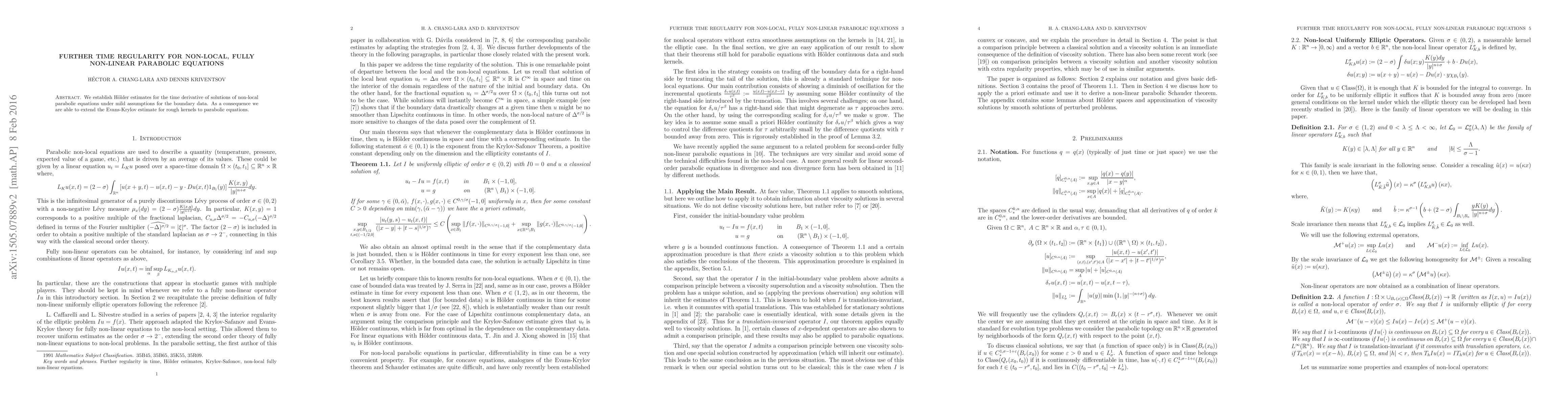 This research extends Hölder estimates for time derivatives of solutions in non-local, fully non-linear parabolic equations, even with mild boundary data assumptions. It also applies these findings to broaden the Evans-Krylov estimate for rougher kernels to parabolic equations.