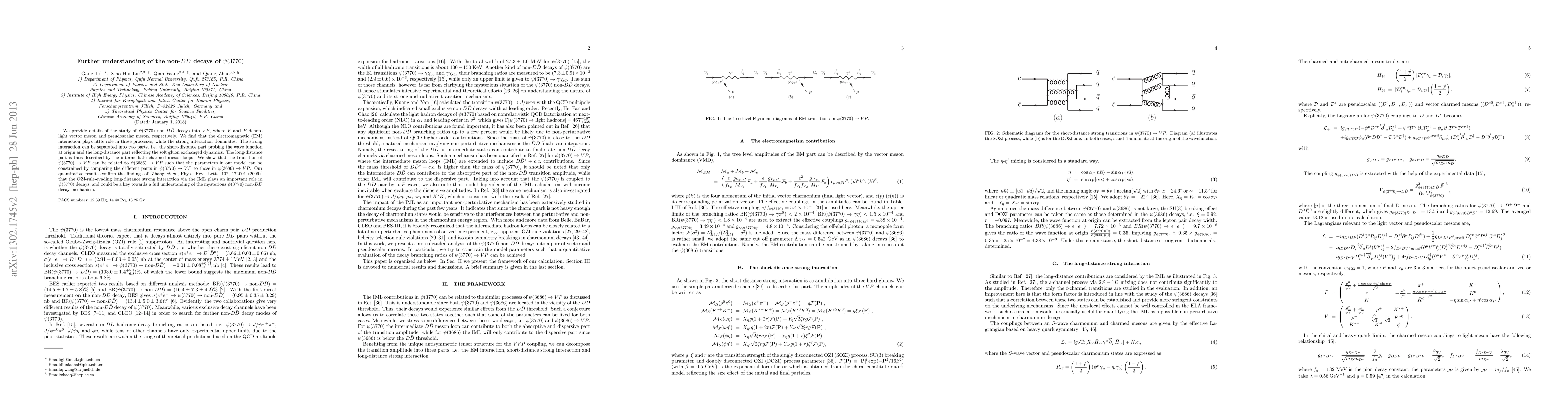 We provide details of the study of $\psi(3770)$ non-$D\bar D$ decays into $VP$, where $V$ and $P$ denote light vector meson and pseudoscalar meson, respectively. We find that the electromagnetic (EM) interaction plays little role in these processes, while the strong interaction dominates. The strong interaction can be separated into two parts, i.e. the short-distance part probing the wave function at origin and the long-distance part reflecting the soft gluon exchanged dynamics. The long-distance part is thus described by the intermediate charmed meson loops. We show that the transition of $\psi(3770)\to VP$ can be related to $\psi(3686)\to VP$ such that the parameters in our model can be constrained by comparing the different parts in $\psi(3770)\to VP$ to those in $\psi(3686)\to VP$. Our quantitative results confirm the findings of [Zhang {\it et al.}, Phys. Rev. Lett. 102, 172001 (2009)] that the OZI-rule-evading long-distance strong interaction via the IML plays an important role in $\psi(3770)$ decays, and could be a key towards a full understanding of the mysterious $\psi(3770)$ non-$D\bar{D}$ decay mechanism.