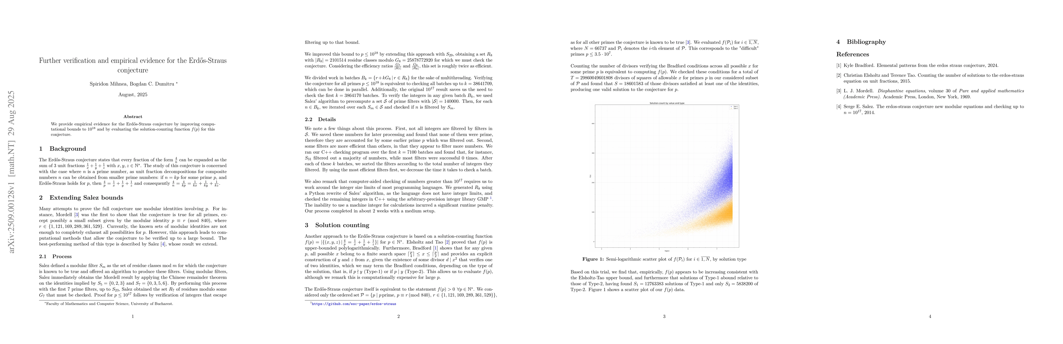 We provide empirical evidence for the Erd\H{o}s-Straus conjecture by improving computational bounds to $10^{18}$ and by evaluating the solution-counting function $f(p)$ for this conjecture.
