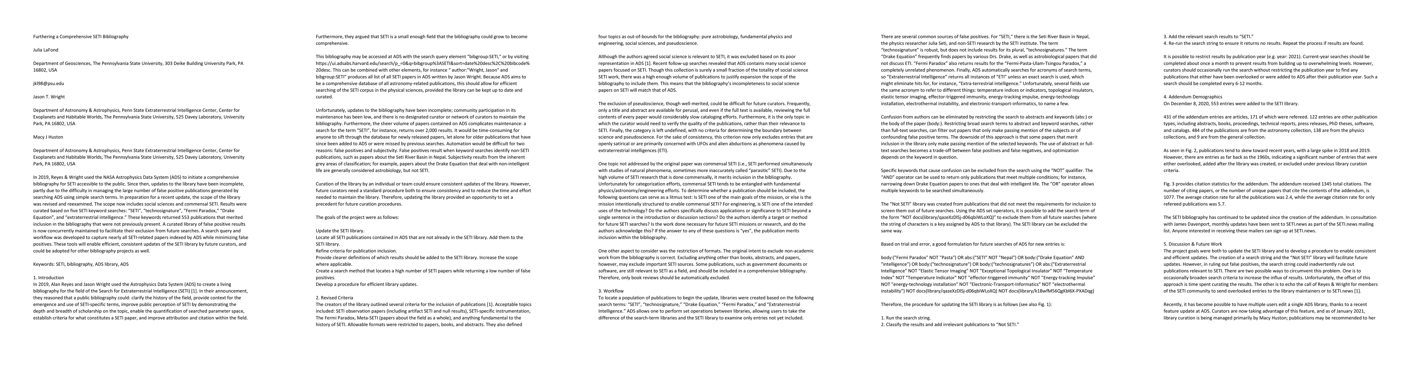 In 2019, Reyes & Wright used the NASA Astrophysics Data System (ADS) to initiate a comprehensive bibliography for SETI accessible to the public. Since then, updates to the library have been incomplete, partly due to the difficulty in managing the large number of false positive publications generated by searching ADS using simple search terms. In preparation for a recent update, the scope of the library was revised and reexamined. The scope now includes social sciences and commensal SETI. Results were curated based on five SETI keyword searches: "SETI", "technosignature", "Fermi Paradox," "Drake Equation", and "extraterrestrial intelligence." These keywords returned 553 publications that merited inclusion in the bibliography that were not previously present. A curated library of false positive results is now concurrently maintained to facilitate their exclusion from future searches. A search query and workflow was developed to capture nearly all SETI-related papers indexed by ADS while minimizing false positives. These tools will enable efficient, consistent updates of the SETI library by future curators, and could be adopted for other bibliography projects as well.