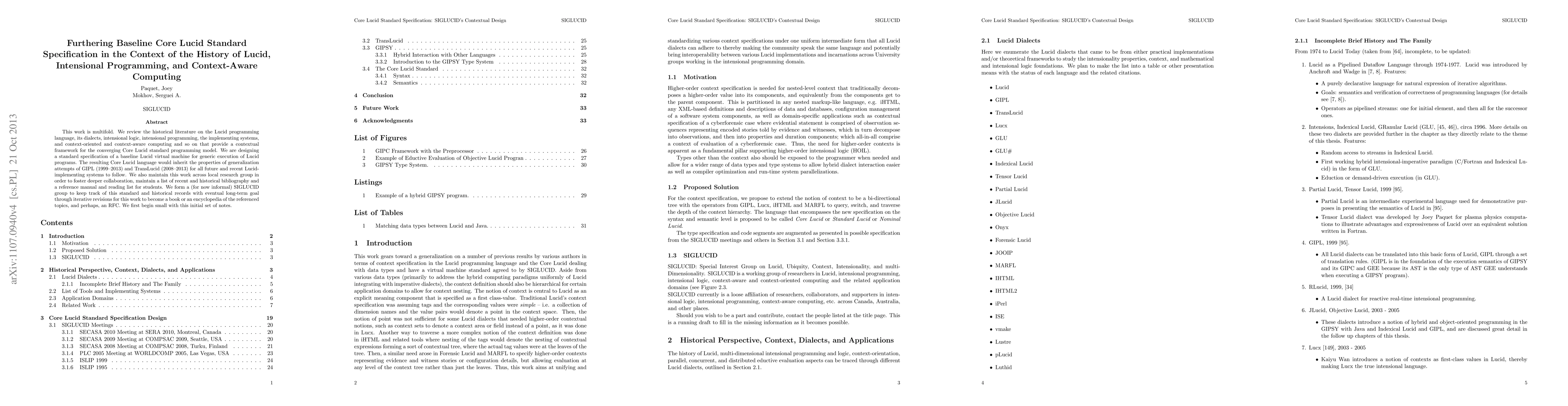 This work is multifold. We review the historical literature on the Lucid programming language, its dialects, intensional logic, intensional programming, the implementing systems, and context-oriented and context-aware computing and so on that provide a contextual framework for the converging Core Lucid standard programming model. We are designing a standard specification of a baseline Lucid virtual machine for generic execution of Lucid programs. The resulting Core Lucid language would inherit the properties of generalization attempts of GIPL (1999-2013) and TransLucid (2008-2013) for all future and recent Lucid implementing systems to follow. We also maintain this work across local research group in order to foster deeper collaboration, maintain a list of recent and historical bibliography and a reference manual and reading list for students. We form a (for now informal) SIGLUCID group to keep track of this standard and historical records with eventual long-term goal through iterative revisions for this work to become a book or an encyclopedia of the referenced topics, and perhaps, an RFC. We first begin small with this initial set of notes.
