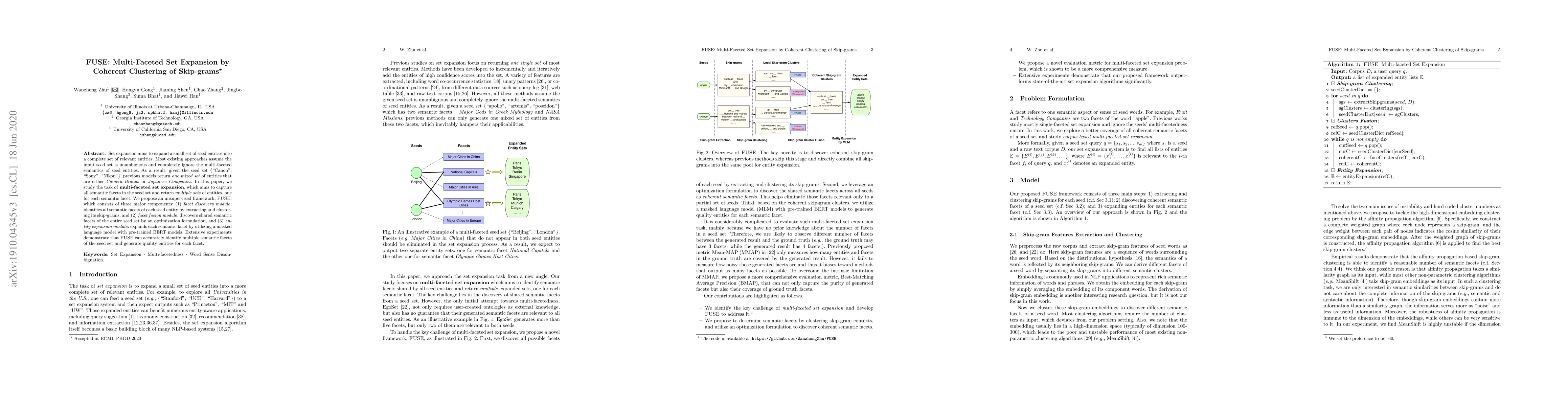 Set expansion aims to expand a small set of seed entities into a complete set of relevant entities. Most existing approaches assume the input seed set is unambiguous and completely ignore the multi-faceted semantics of seed entities. As a result, given the seed set {"Canon", "Sony", "Nikon"}, previous models return one mixed set of entities that are either Camera Brands or Japanese Companies. In this paper, we study the task of multi-faceted set expansion, which aims to capture all semantic facets in the seed set and return multiple sets of entities, one for each semantic facet. We propose an unsupervised framework, FUSE, which consists of three major components: (1) facet discovery module: identifies all semantic facets of each seed entity by extracting and clustering its skip-grams, and (2) facet fusion module: discovers shared semantic facets of the entire seed set by an optimization formulation, and (3) entity expansion module: expands each semantic facet by utilizing a masked language model with pre-trained BERT models. Extensive experiments demonstrate that FUSE can accurately identify multiple semantic facets of the seed set and generate quality entities for each facet.