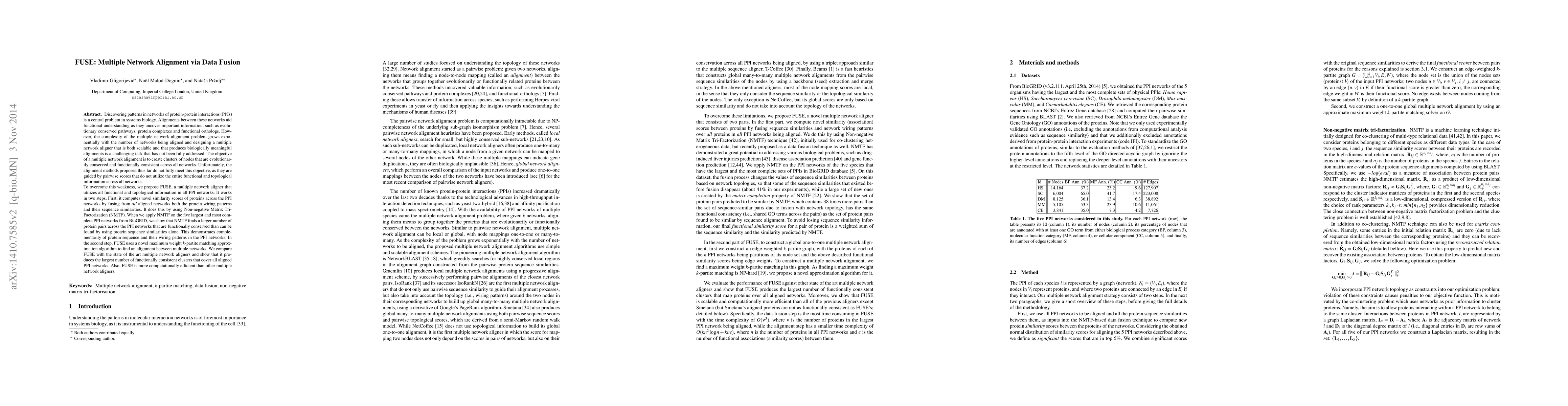 FUSE is a novel multiple network aligner that leverages both functional and topological information across protein-protein interaction networks to identify evolutionarily conserved clusters. It employs Non-negative Matrix Tri-Factorization to fuse sequence and wiring pattern similarities, followed by a maximum weight k-partite matching algorithm, outperforming existing methods in both alignment accuracy and computational efficiency.