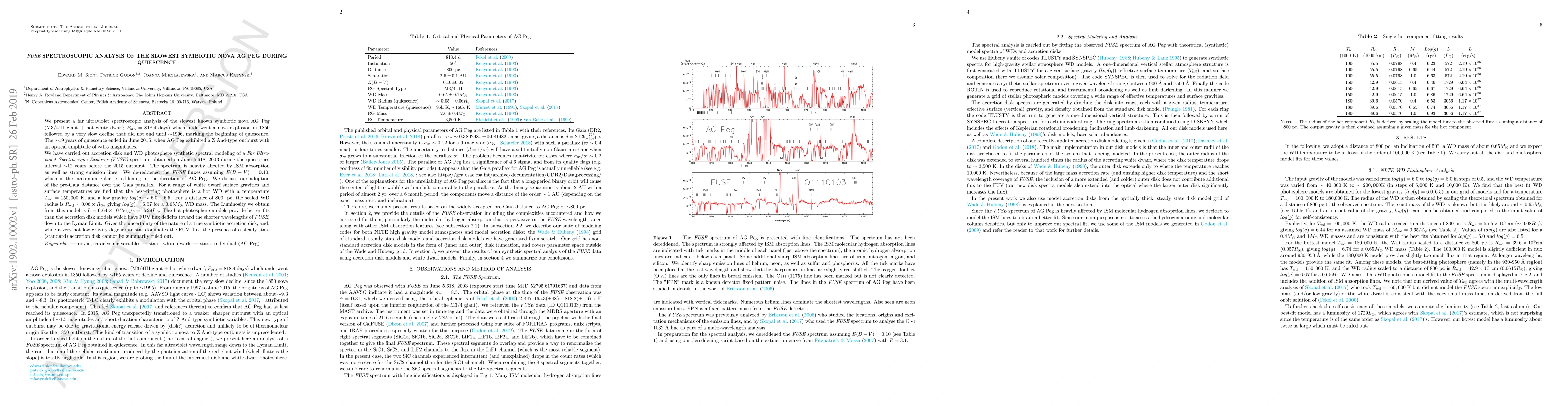 This paper presents a spectroscopic analysis of the symbiotic nova AG Peg during its quiescence, revealing a hot white dwarf photosphere with a temperature of 150,000 K and low gravity. The FUSE spectrum indicates a possible steady-state accretion disk despite the dominance of the white dwarf's flux.
