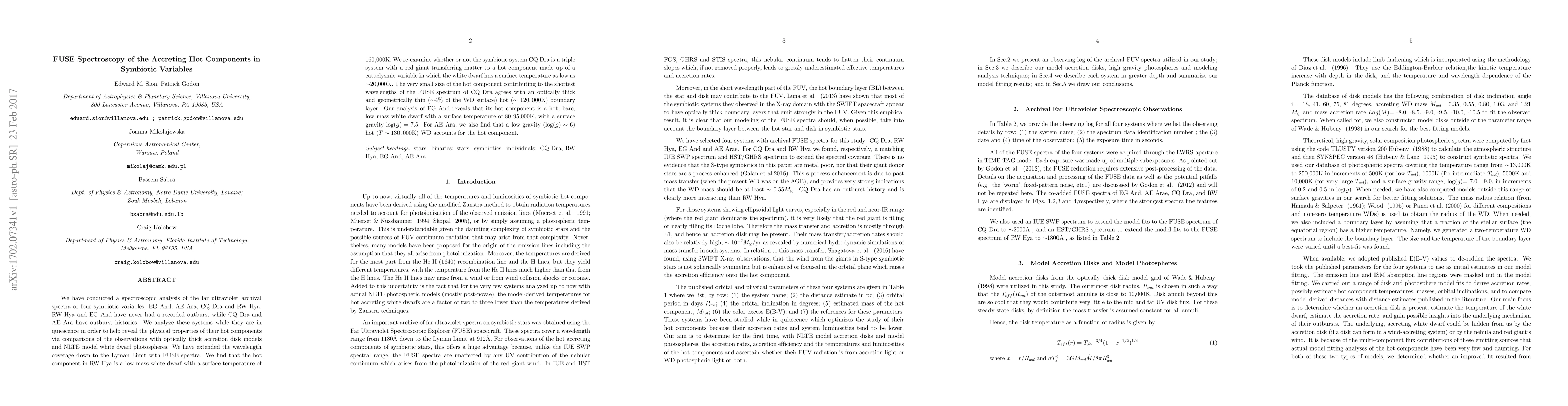 We have conducted a spectroscopic analysis of the far ultraviolet archival spectra of four symbiotic variables, EG And, AE Ara, CQ Dra and RW Hya. RW Hya and EG And have never had a recorded outburst while CQ Dra and AE Ara have outburst histories. We analyze these systems while they are in quiescence in order to help reveal the physical properties of their hot components via comparisons of the observations with optically thick accretion disk models and NLTE model white dwarf photospheres. We have extended the wavelength coverage down to the Lyman Limit with FUSE spectra. We find that the hot component in RW Hya is a low mass white dwarf with a surface temperature of 160,000K. We re-examine whether or not the symbiotic system CQ Dra is a triple system with a red giant transferring matter to a hot component made up of a cataclysmic variable in which the white dwarf has a surface temperature as low as $\sim$20,000K. The very small size of the hot component contributing to the shortest wavelengths of the FUSE spectrum of CQ Dra agrees with an optically thick and geometrically thin ($\sim$4\% of the WD surface) hot ($\sim 120,000$K) boundary layer. Our analysis of EG And reveals that its hot component is a hot, bare, low mass white dwarf with a surface temperature of 80-95,000K, with a surface gravity $\log(g)= 7.5$. For AE Ara, we also find that a low gravity ($\log(g) \sim 6$) hot ($T \sim 130,000$K) WD accounts for the hot component.