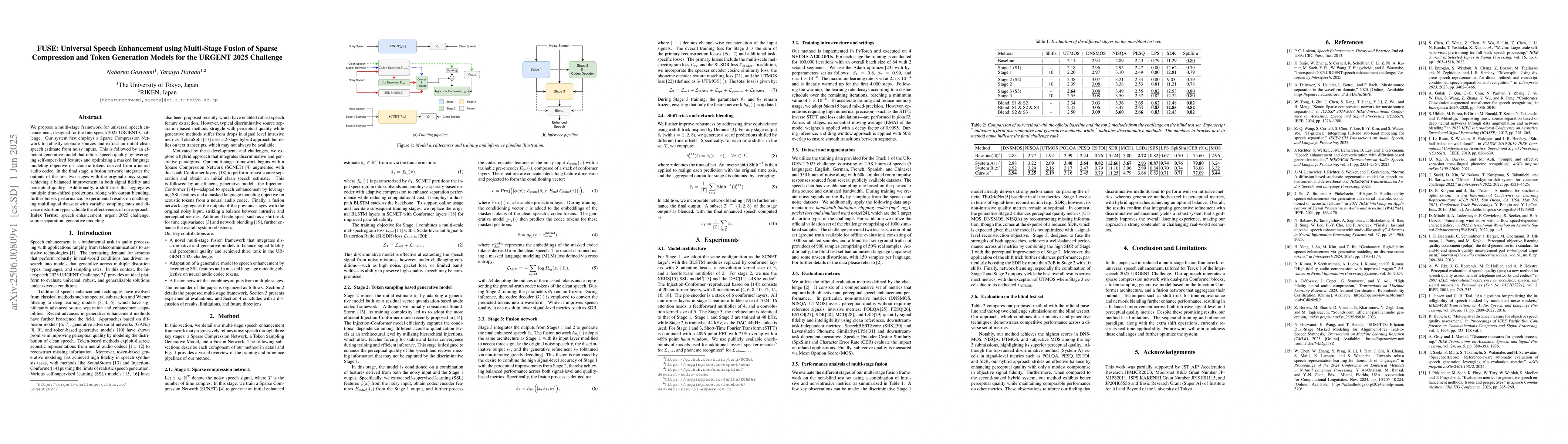 A new speech enhancement system uses multi-stage fusion of sparse compression and token generation models to improve both signal fidelity and perceptual quality in noisy audio, with promising results on multilingual datasets.