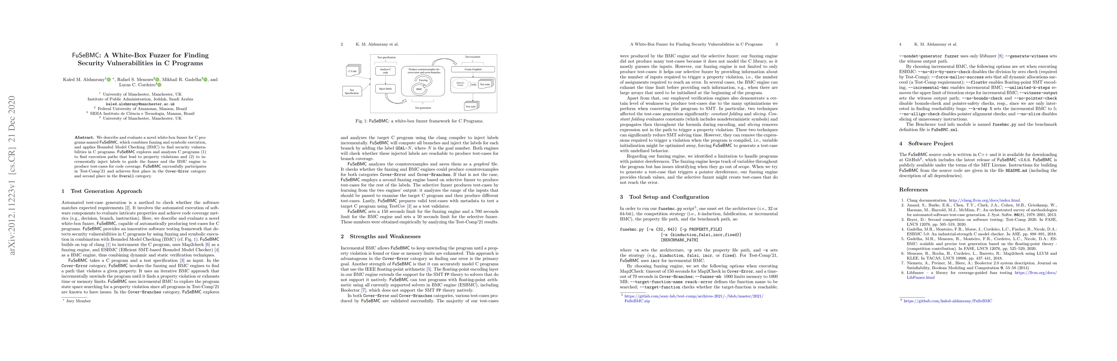 FuSeBMC is a white-box fuzzer that integrates fuzzing, symbolic execution, and Bounded Model Checking to identify security vulnerabilities in C programs. It excels in finding execution paths leading to property violations and enhances code coverage through incremental label injection.
