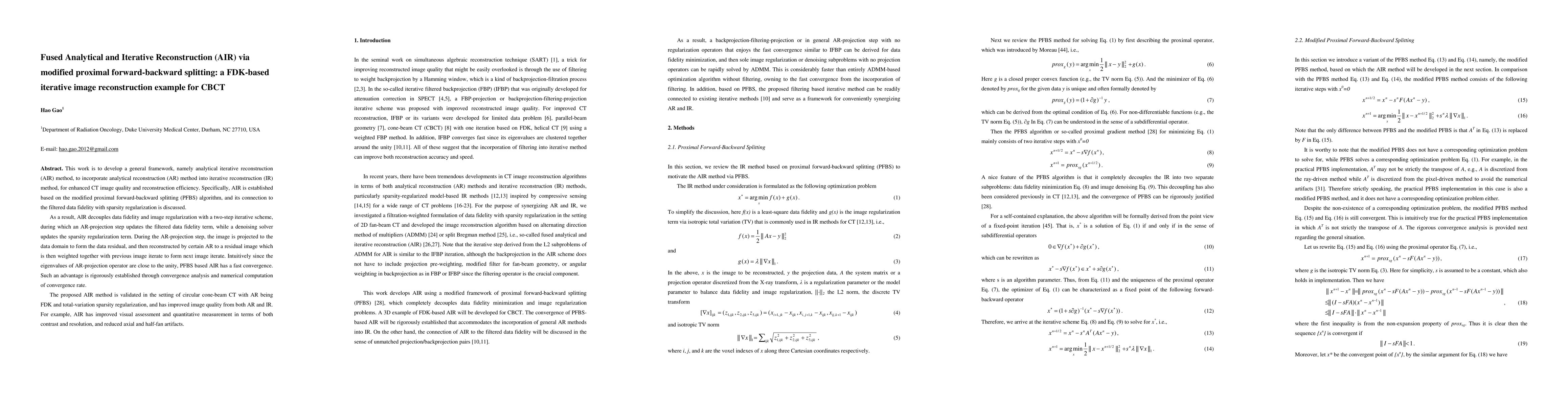 This paper proposes a novel analytical iterative reconstruction (AIR) method based on modified proximal forward-backward splitting for enhanced CT image quality and efficiency. The AIR method combines analytical and iterative reconstruction techniques, achieving fast convergence and improved image quality in circular cone-beam CT.