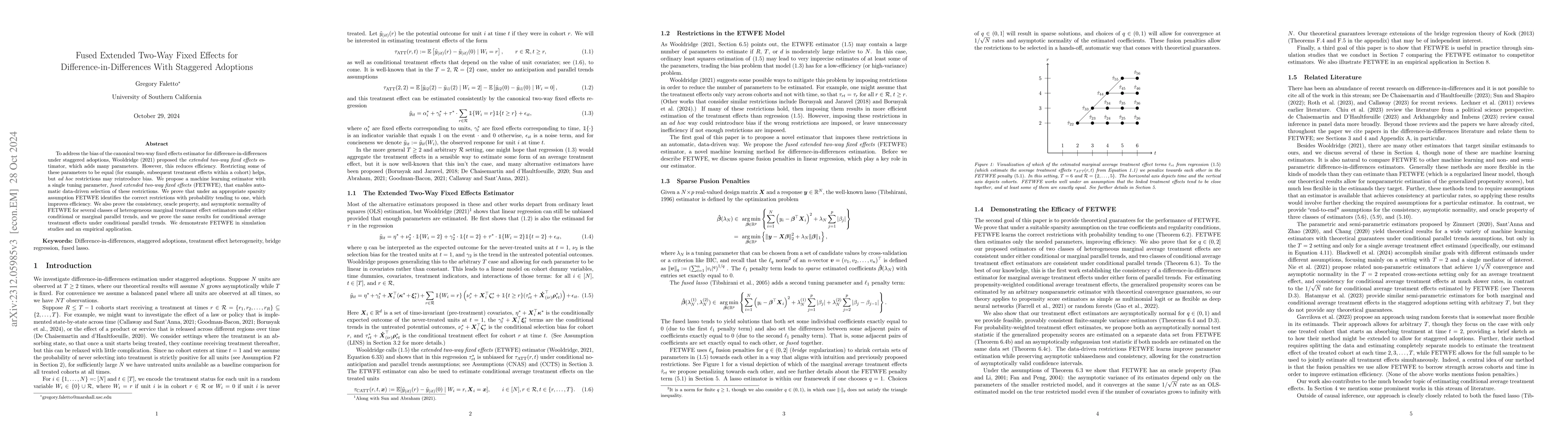 This paper proposes a fused extended two-way fixed effects (FETWFE) estimator to improve efficiency in difference-in-differences models with staggered adoptions. The FETWFE method uses machine learning to automatically select appropriate parameter restrictions, ensuring bias reduction while maintaining statistical consistency and asymptotic normality.