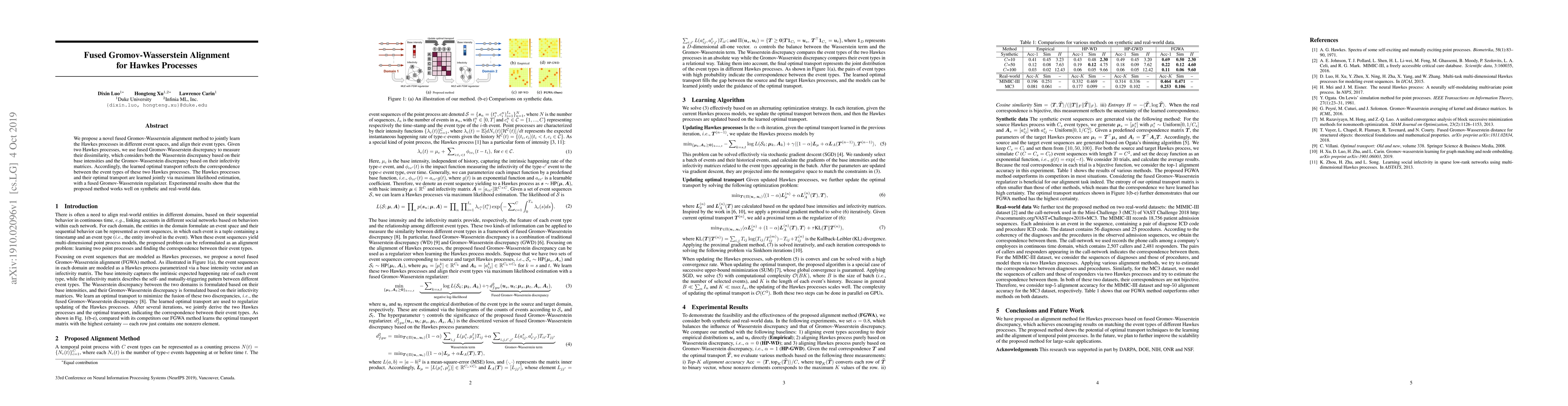This paper introduces a fused Gromov-Wasserstein alignment method for jointly learning and aligning Hawkes processes across different event spaces. The method measures dissimilarity using a combined discrepancy that accounts for both base intensity and infectivity matrix differences, and it demonstrates effectiveness on synthetic and real-world data.