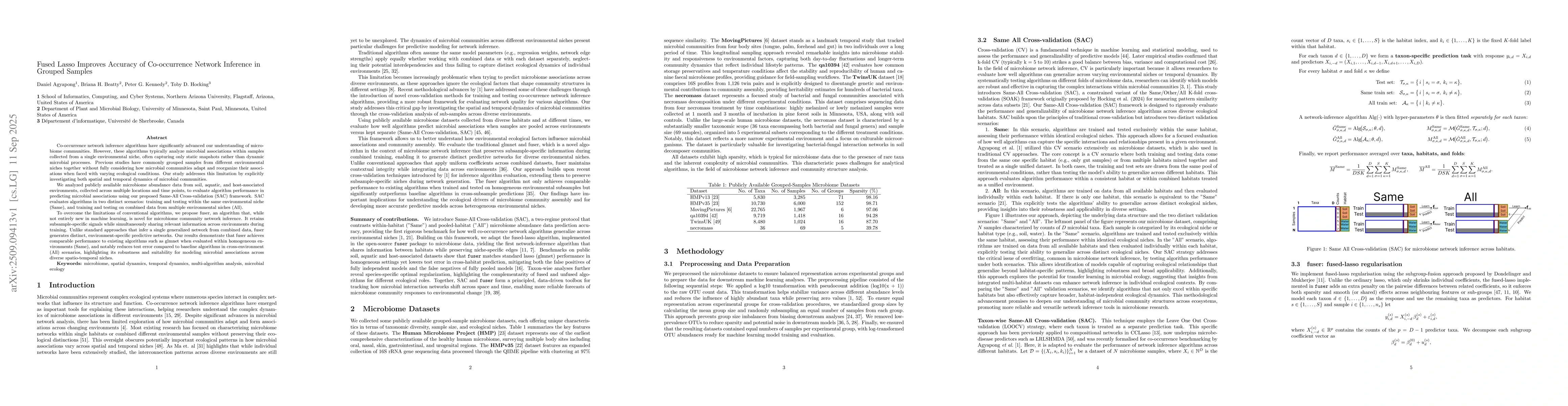 Co-occurrence network inference algorithms have significantly advanced our understanding of microbiome communities. However, these algorithms typically analyze microbial associations within samples collected from a single environmental niche, often capturing only static snapshots rather than dynamic microbial processes. Previous studies have commonly grouped samples from different environmental niches together without fully considering how microbial communities adapt their associations when faced with varying ecological conditions. Our study addresses this limitation by explicitly investigating both spatial and temporal dynamics of microbial communities. We analyzed publicly available microbiome abundance data across multiple locations and time points, to evaluate algorithm performance in predicting microbial associations using our proposed Same-All Cross-validation (SAC) framework. SAC evaluates algorithms in two distinct scenarios: training and testing within the same environmental niche (Same), and training and testing on combined data from multiple environmental niches (All). To overcome the limitations of conventional algorithms, we propose fuser, an algorithm that, while not entirely new in machine learning, is novel for microbiome community network inference. It retains subsample-specific signals while simultaneously sharing relevant information across environments during training. Unlike standard approaches that infer a single generalized network from combined data, fuser generates distinct, environment-specific predictive networks. Our results demonstrate that fuser achieves comparable predictive performance to existing algorithms such as glmnet when evaluated within homogeneous environments (Same), and notably reduces test error compared to baseline algorithms in cross-environment (All) scenarios.