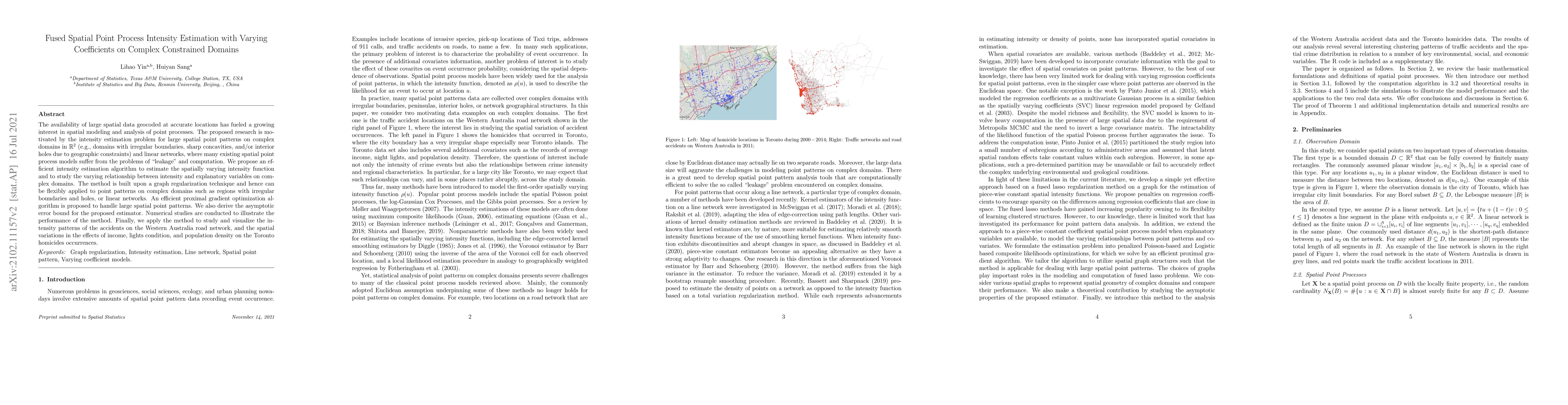 This paper proposes an efficient intensity estimation algorithm for spatial point patterns on complex domains, addressing issues like "leakage" and computational challenges. The method utilizes graph regularization and a proximal gradient optimization algorithm, and is demonstrated through applications on road accident and homicide data.