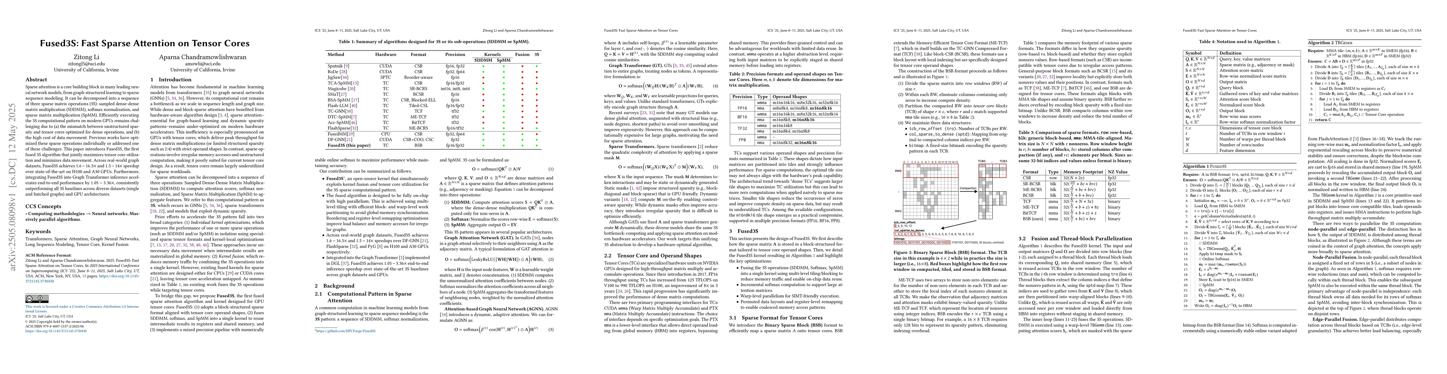 The paper introduces Fused3S, a fused algorithm for executing the three sparse matrix operations (3S) - sampled dense-dense matrix multiplication (SDDMM), softmax normalization, and sparse matrix multiplication (SpMM) - efficiently on modern GPUs by maximizing tensor core utilization and minimizing data movement.