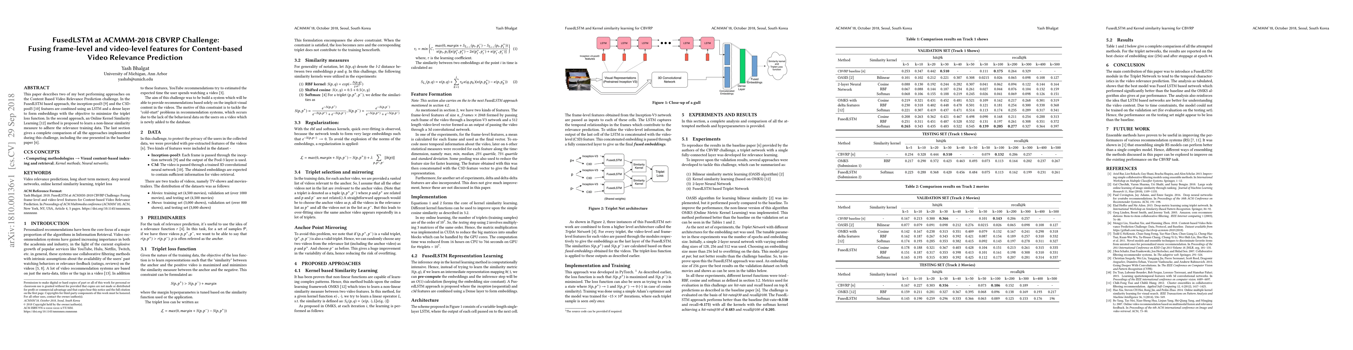 This paper presents two approaches for Content-based Video Relevance Prediction: FusedLSTM combines frame-level and video-level features using LSTM and dense layers to minimize the triplet loss function. The second approach uses Online Kernel Similarity Learning for a non-linear similarity measure, followed by a comparative analysis of all methods used in the challenge.