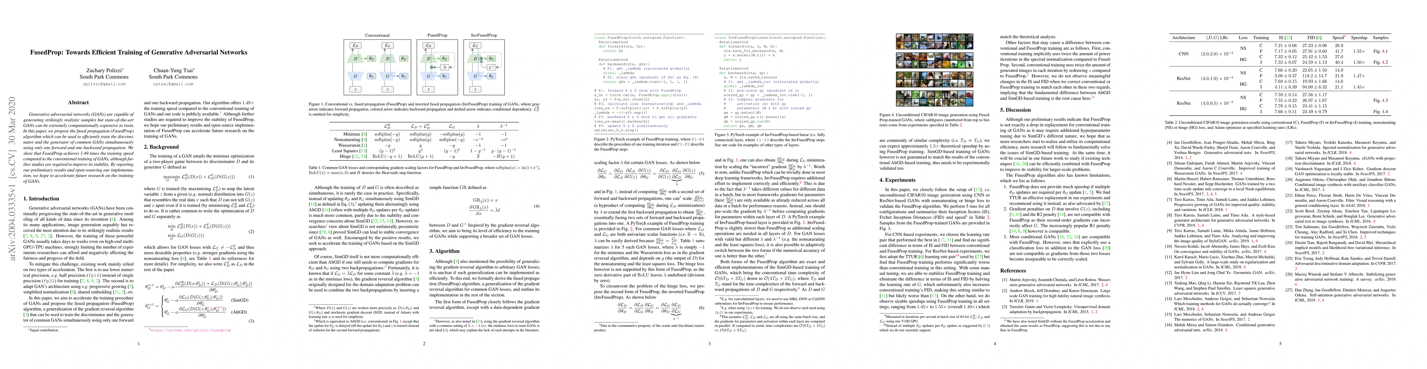 The FusedProp algorithm proposes a method to efficiently train GANs by combining the forward and backward propagation steps for both the discriminator and generator into a single pass, achieving a 1.49x speedup over conventional training. Further research is needed to enhance its stability.