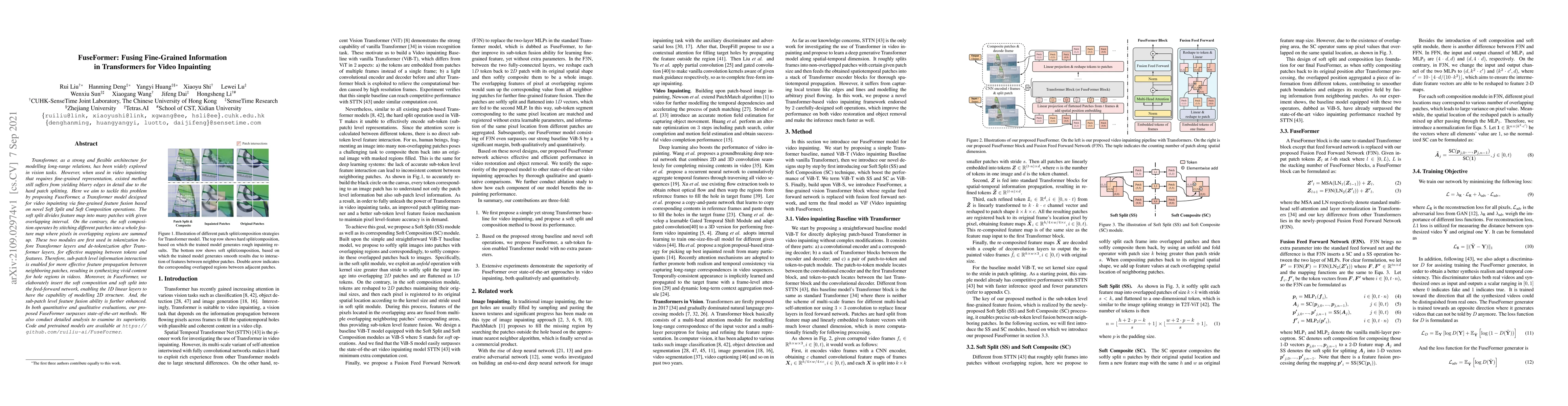 FuseFormer introduces a novel Transformer model for video inpainting that utilizes Soft Split and Soft Composition operations to fuse fine-grained features, addressing the issue of blurry edges in detail. The model outperforms existing methods in both quantitative and qualitative evaluations, demonstrating superior performance in synthesizing vivid content.