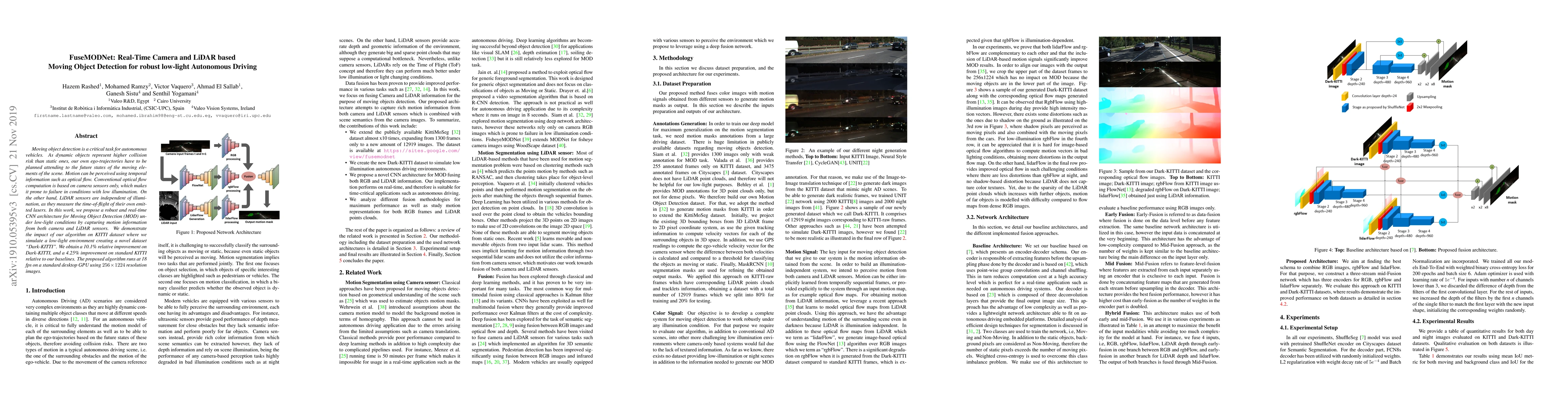 FuseMODNet integrates camera and LiDAR data to enhance real-time moving object detection in low-light conditions for autonomous driving. The proposed CNN architecture achieves a 10.1% relative improvement on a simulated low-light dataset, "Dark KITTI," and runs at 18 fps on a standard GPU.
