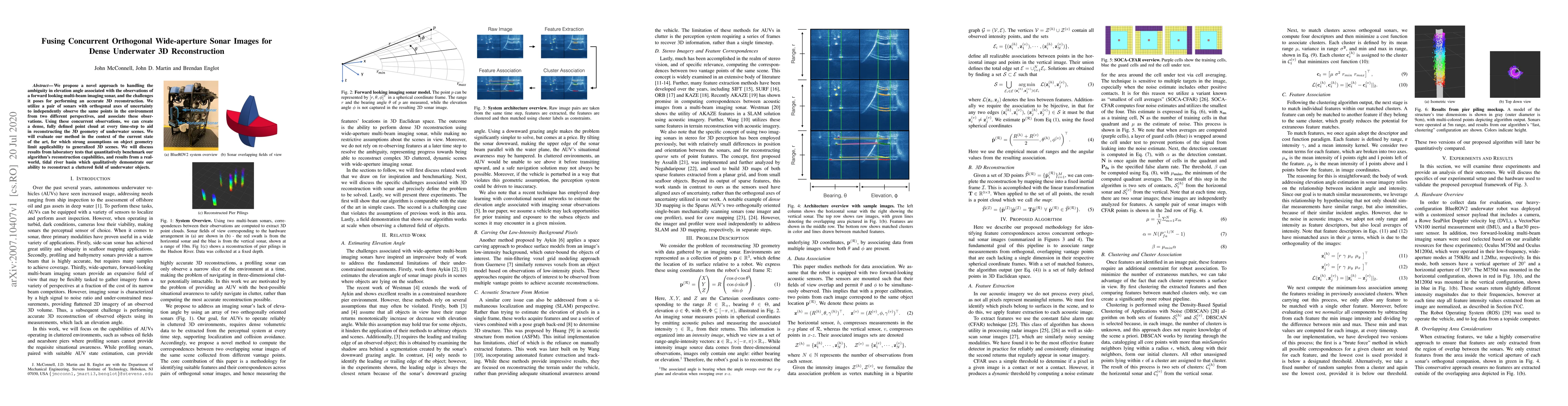 We propose a novel approach to handling the ambiguity in elevation angle associated with the observations of a forward looking multi-beam imaging sonar, and the challenges it poses for performing an accurate 3D reconstruction. We utilize a pair of sonars with orthogonal axes of uncertainty to independently observe the same points in the environment from two different perspectives, and associate these observations. Using these concurrent observations, we can create a dense, fully defined point cloud at every time-step to aid in reconstructing the 3D geometry of underwater scenes. We will evaluate our method in the context of the current state of the art, for which strong assumptions on object geometry limit applicability to generalized 3D scenes. We will discuss results from laboratory tests that quantitatively benchmark our algorithm's reconstruction capabilities, and results from a real-world, tidal river basin which qualitatively demonstrate our ability to reconstruct a cluttered field of underwater objects.