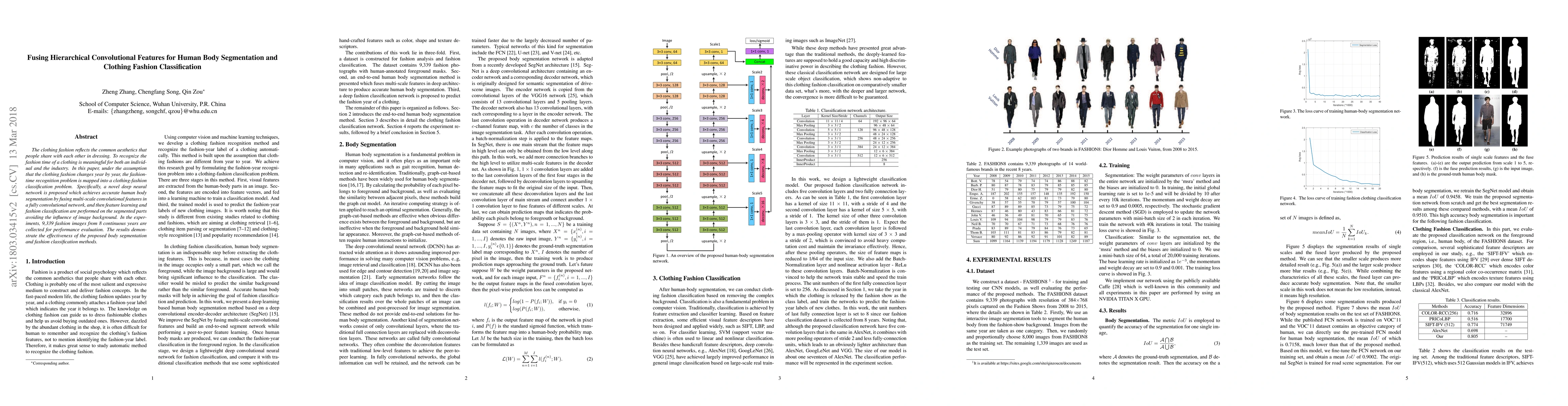 This paper proposes a deep neural network that fuses hierarchical convolutional features for accurate human body segmentation and clothing fashion classification, avoiding background influence. Experiments on 9,339 fashion images from 8 years show the effectiveness of the proposed methods.