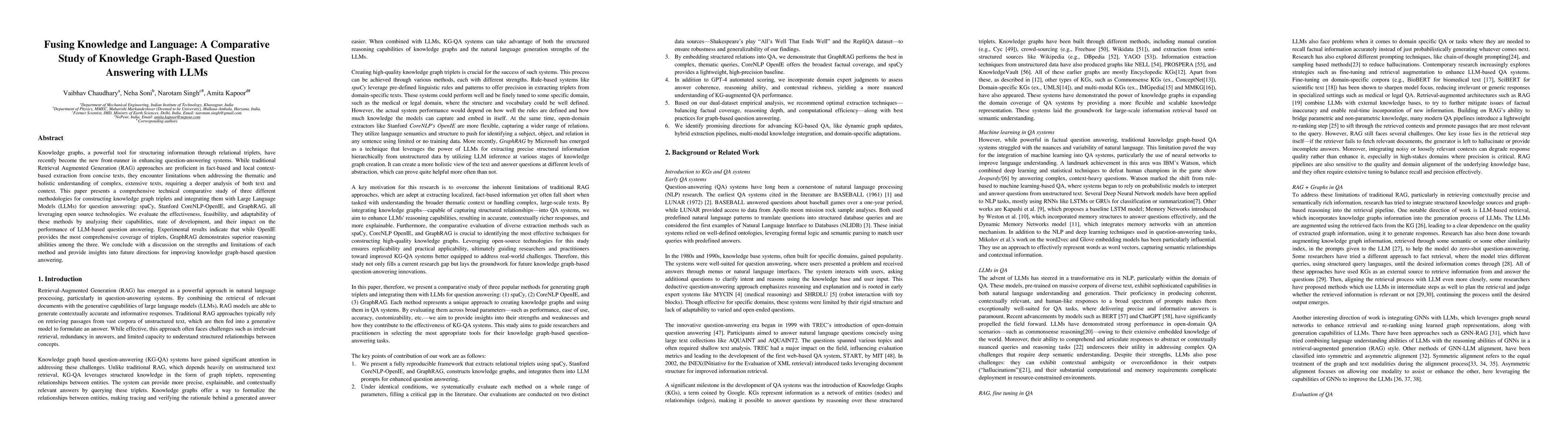 Knowledge graphs, a powerful tool for structuring information through relational triplets, have recently become the new front-runner in enhancing question-answering systems. While traditional Retrieval Augmented Generation (RAG) approaches are proficient in fact-based and local context-based extraction from concise texts, they encounter limitations when addressing the thematic and holistic understanding of complex, extensive texts, requiring a deeper analysis of both text and context. This paper presents a comprehensive technical comparative study of three different methodologies for constructing knowledge graph triplets and integrating them with Large Language Models (LLMs) for question answering: spaCy, Stanford CoreNLP-OpenIE, and GraphRAG, all leveraging open source technologies. We evaluate the effectiveness, feasibility, and adaptability of these methods by analyzing their capabilities, state of development, and their impact on the performance of LLM-based question answering. Experimental results indicate that while OpenIE provides the most comprehensive coverage of triplets, GraphRAG demonstrates superior reasoning abilities among the three. We conclude with a discussion on the strengths and limitations of each method and provide insights into future directions for improving knowledge graph-based question answering.