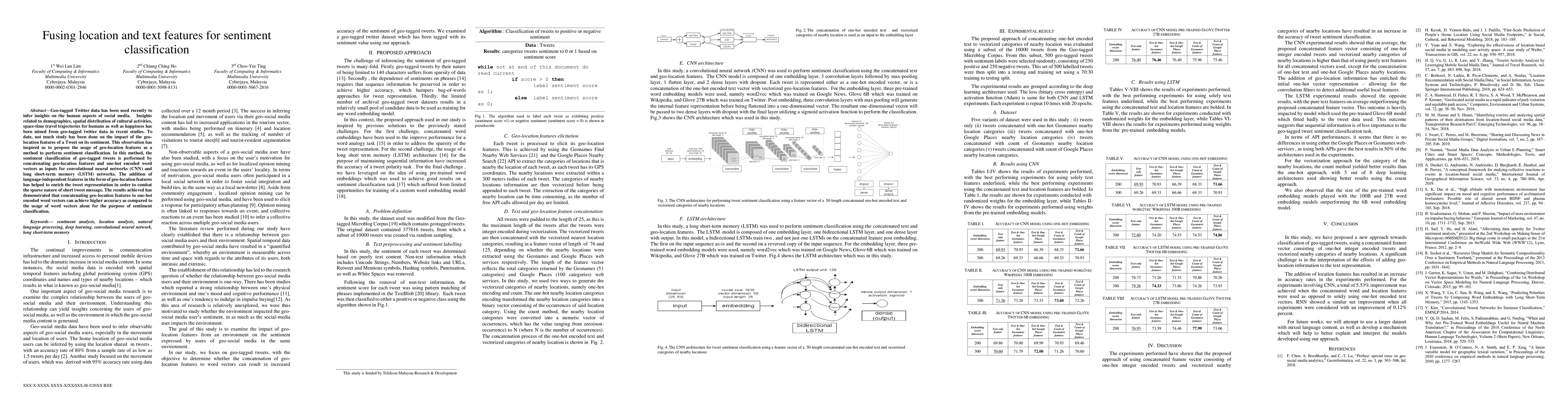 Geo-tagged Twitter data has been used recently to infer insights on the human aspects of social media. Insights related to demographics, spatial distribution of cultural activities, space-time travel trajectories for humans as well as happiness has been mined from geo-tagged twitter data in recent studies. To date, not much study has been done on the impact of the geolocation features of a Tweet on its sentiment. This observation has inspired us to propose the usage of geo-location features as a method to perform sentiment classification. In this method, the sentiment classification of geo-tagged tweets is performed by concatenating geo-location features and one-hot encoded word vectors as inputs for convolutional neural networks (CNN) and long short-term memory (LSTM) networks. The addition of language-independent features in the form of geo-location features has helped to enrich the tweet representation in order to combat the sparse nature of short tweet message. The results achieved has demonstrated that concatenating geo-location features to one-hot encoded word vectors can achieve higher accuracy as compared to the usage of word vectors alone for the purpose of sentiment classification.